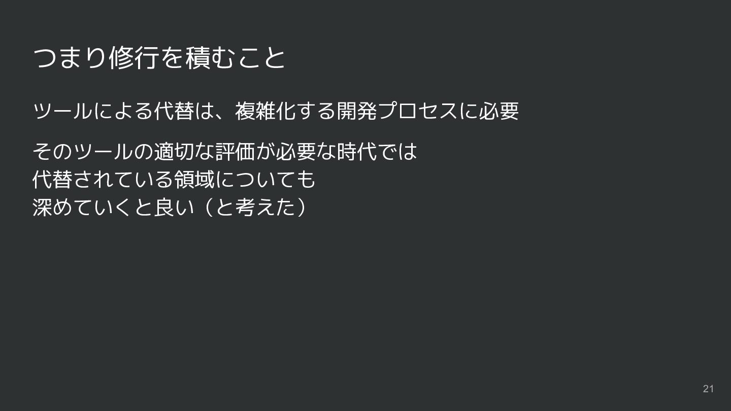 つまり修行を積むこと ツールによる代替は、複雑化する開発プロセスに必要 そのツールの適切な評価が必要な時代では 代替されている領域についても 深めていくと良い(と考えた) 21
