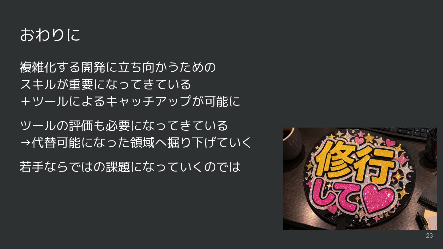 おわりに 複雑化する開発に立ち向かうための スキルが重要になってきている +ツールによるキャッチアップが可能に ツールの評価も必要になってきている →代替可能になった領域へ掘り下げていく 若手ならではの課題になっていくのでは 23