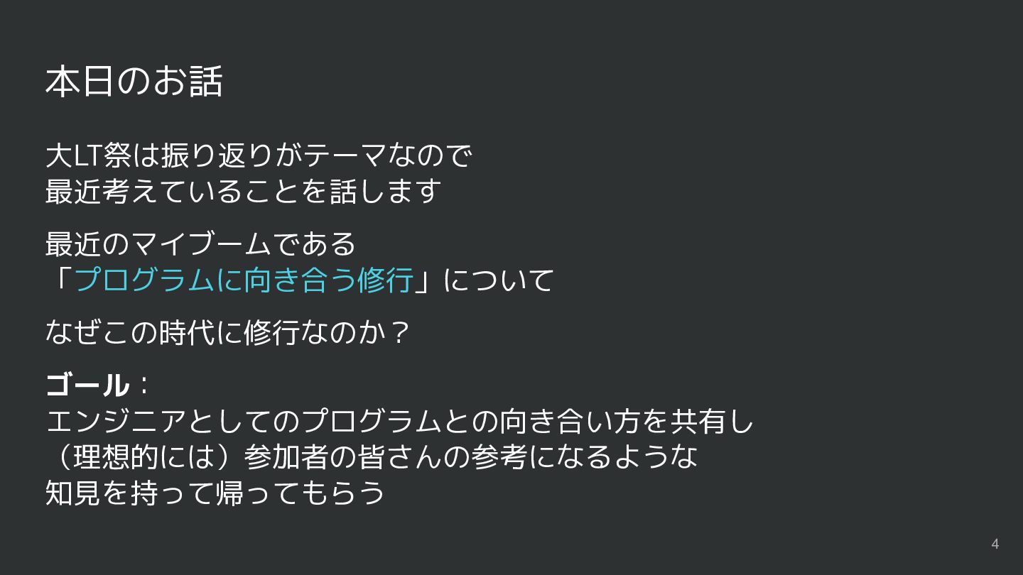 本日のお話 大LT祭は振り返りがテーマなので 最近考えていることを話します 最近のマイブームである 「プログラムに向き合う修行」について なぜこの時代に修行なのか? ゴール: エンジニアとしてのプログラムとの向き合い方を共有し (理想的には)参加者の皆さんの参考になるような 知見を持って帰ってもらう