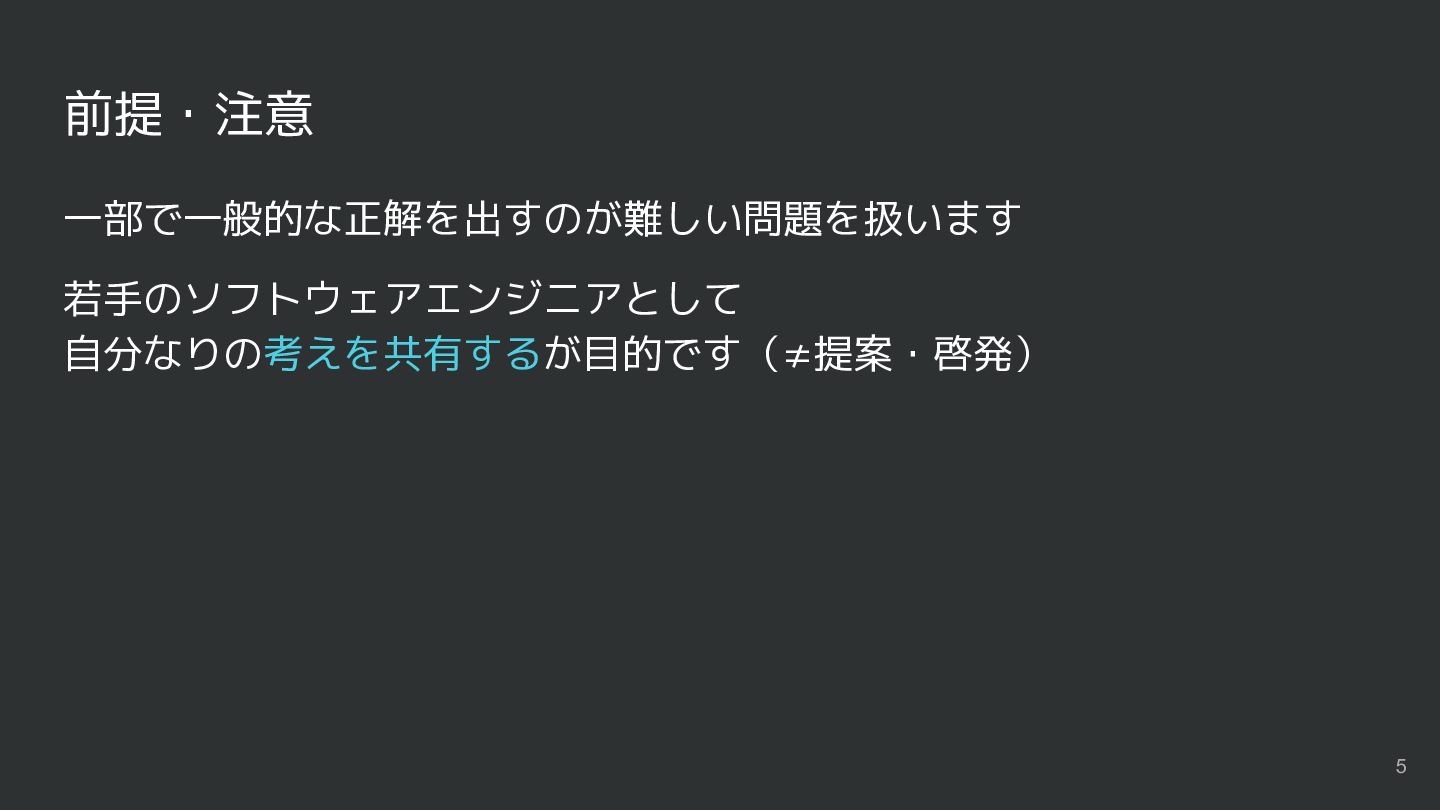 前提・注意 一部で一般的な正解を出すのが難しい問題を扱います 若手のソフトウェアエンジニアとして 自分なりの考えを共有するが目的です(≠提案・啓発) 5
