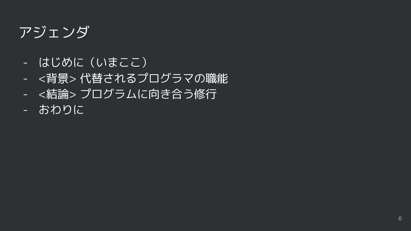 アジェンダ - はじめに(いまここ) - <背景> 代替されるプログラマの職能 - <結論> プログラムに向き合う修行 -