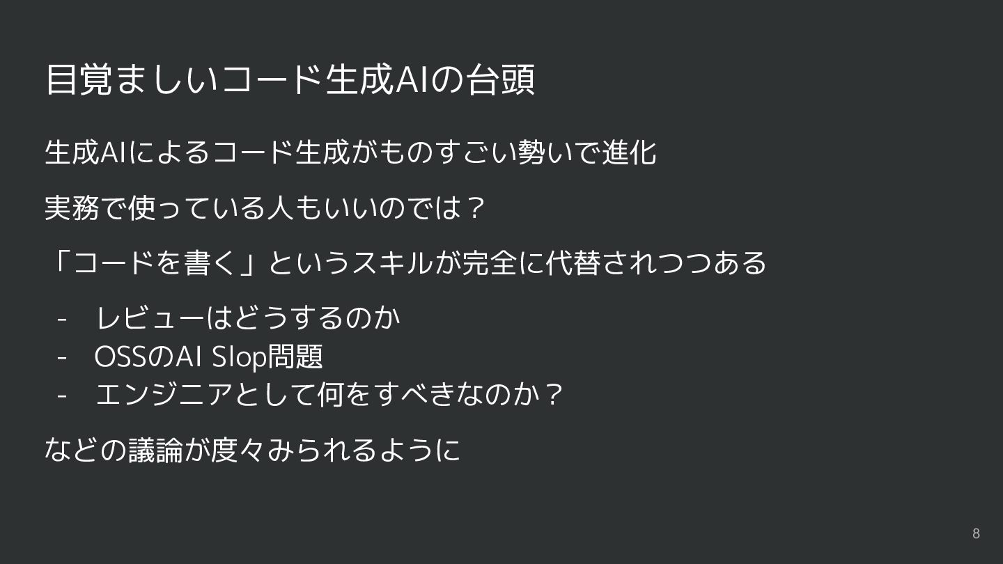目覚ましいコード生成AIの台頭 生成AIによるコード生成がものすごい勢いで進化 実務で使っている人もいいのでは? 「コードを書く」というスキルが完全に代替されつつある - レビューはどうするのか - OSSのAI Slop問題 -