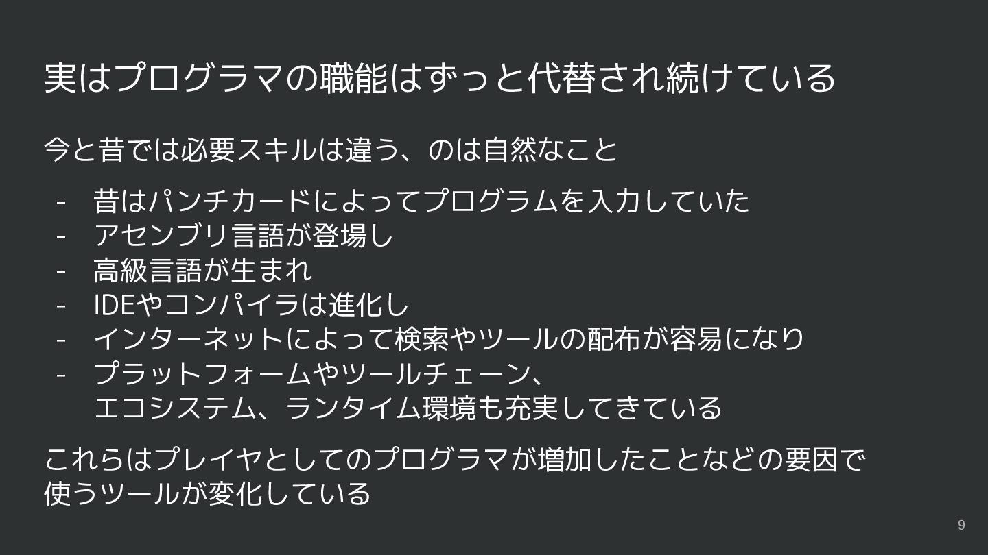 実はプログラマの職能はずっと代替され続けている 今と昔では必要スキルは違う、のは自然なこと - 昔はパンチカードによってプログラムを入力していた - アセンブリ言語が登場し - 高級言語が生まれ - IDEやコンパイラは進化し