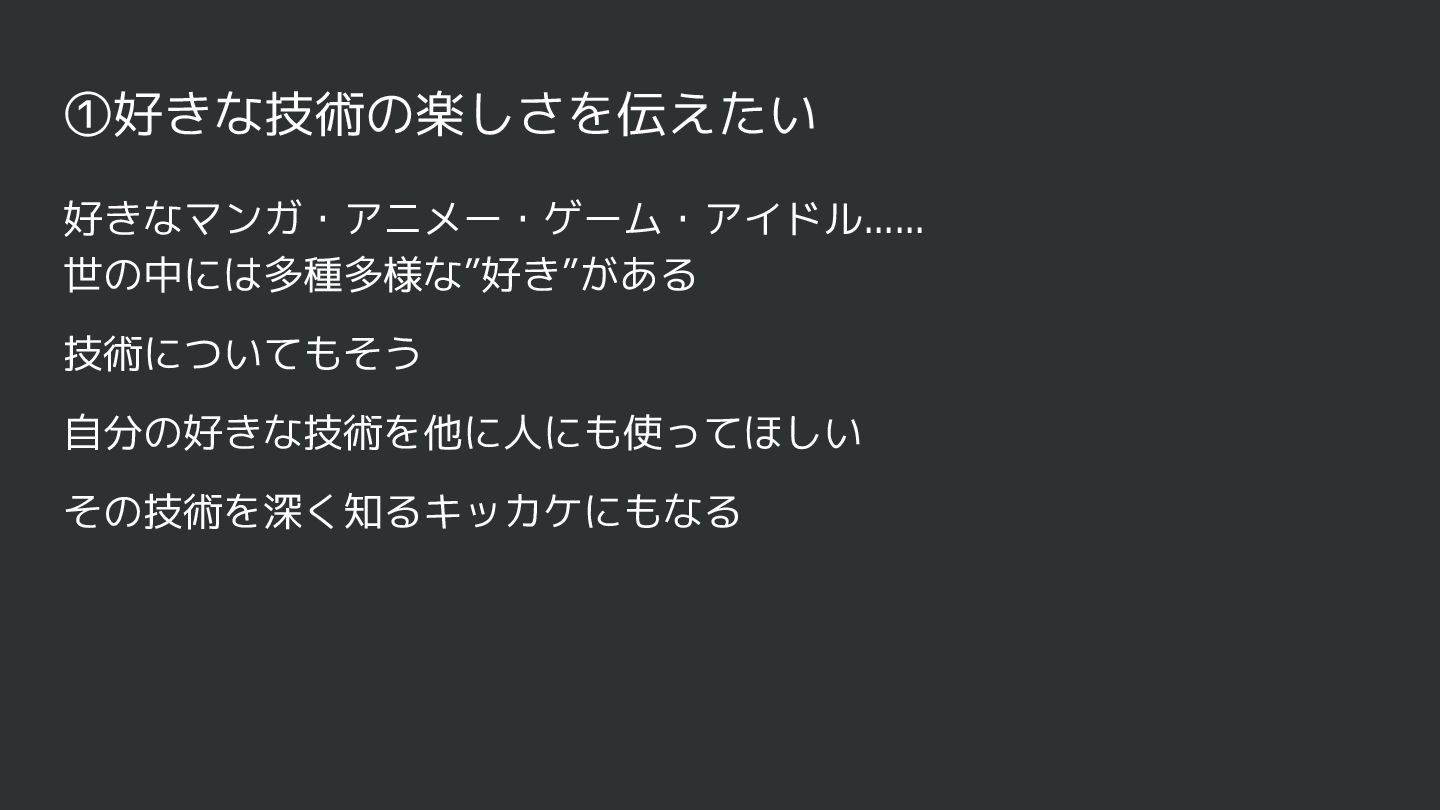 ①好きな技術の楽しさを伝えたい 好きなマンガ・アニメー・ゲーム・アイドル...... 世の中には多種多様な”好き”がある 技術についてもそう 自分の好きな技術を他に人にも使ってほしい その技術を深く知るキッカケにもなる