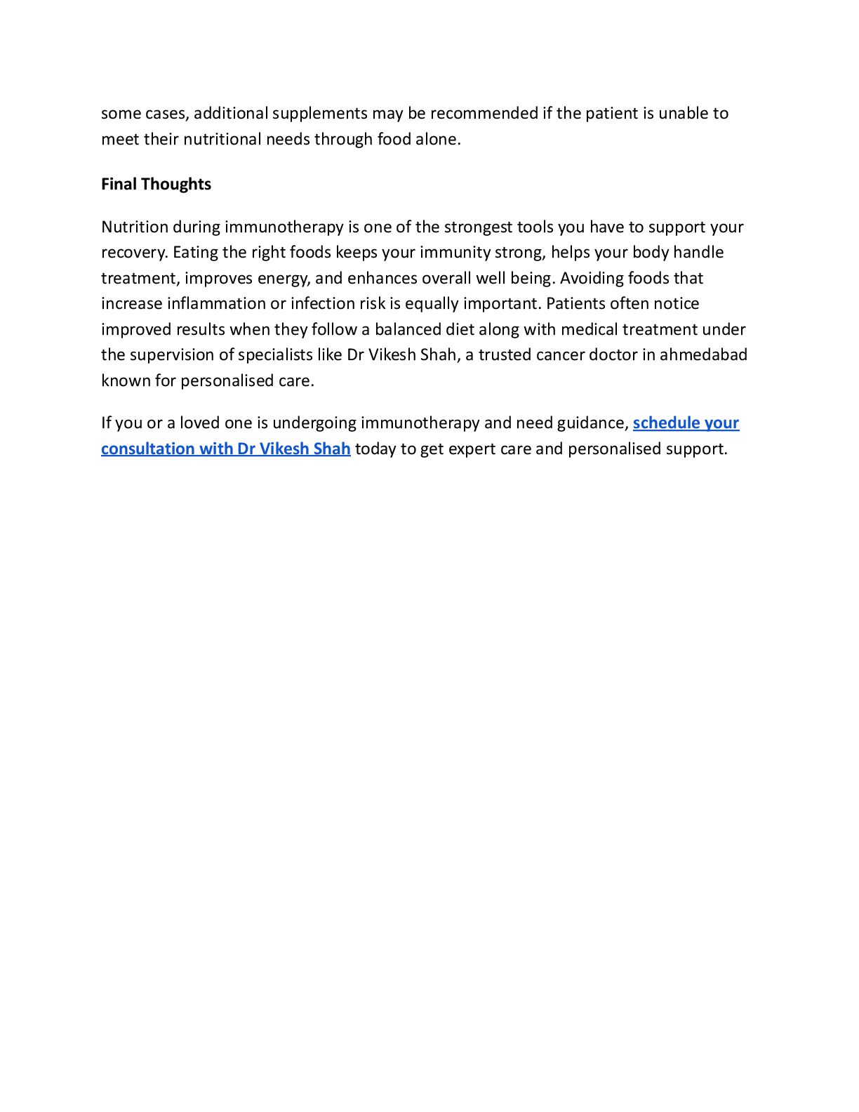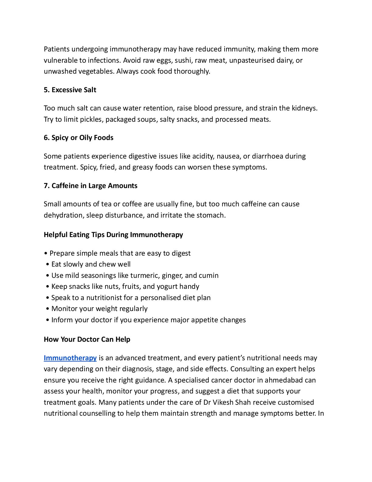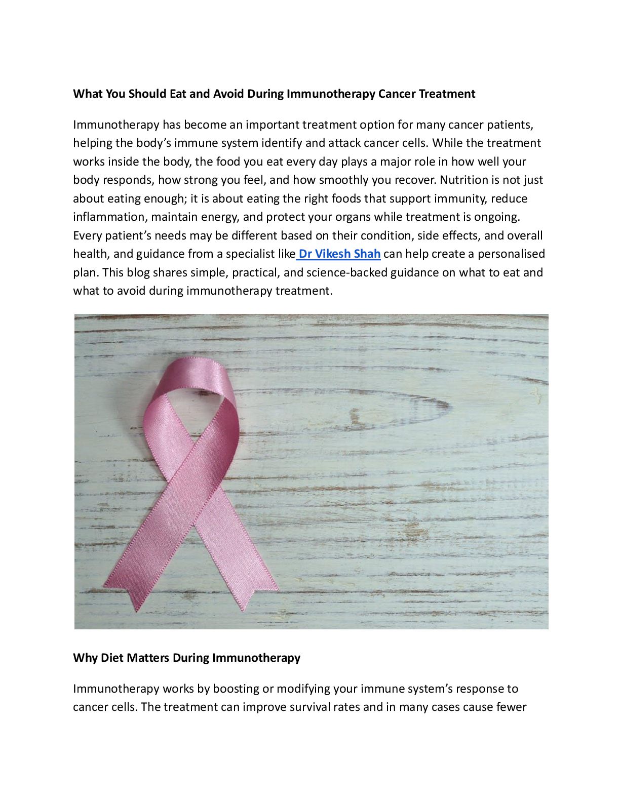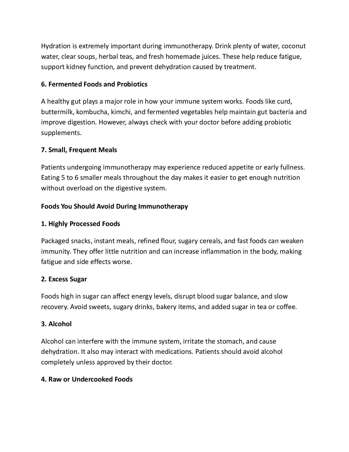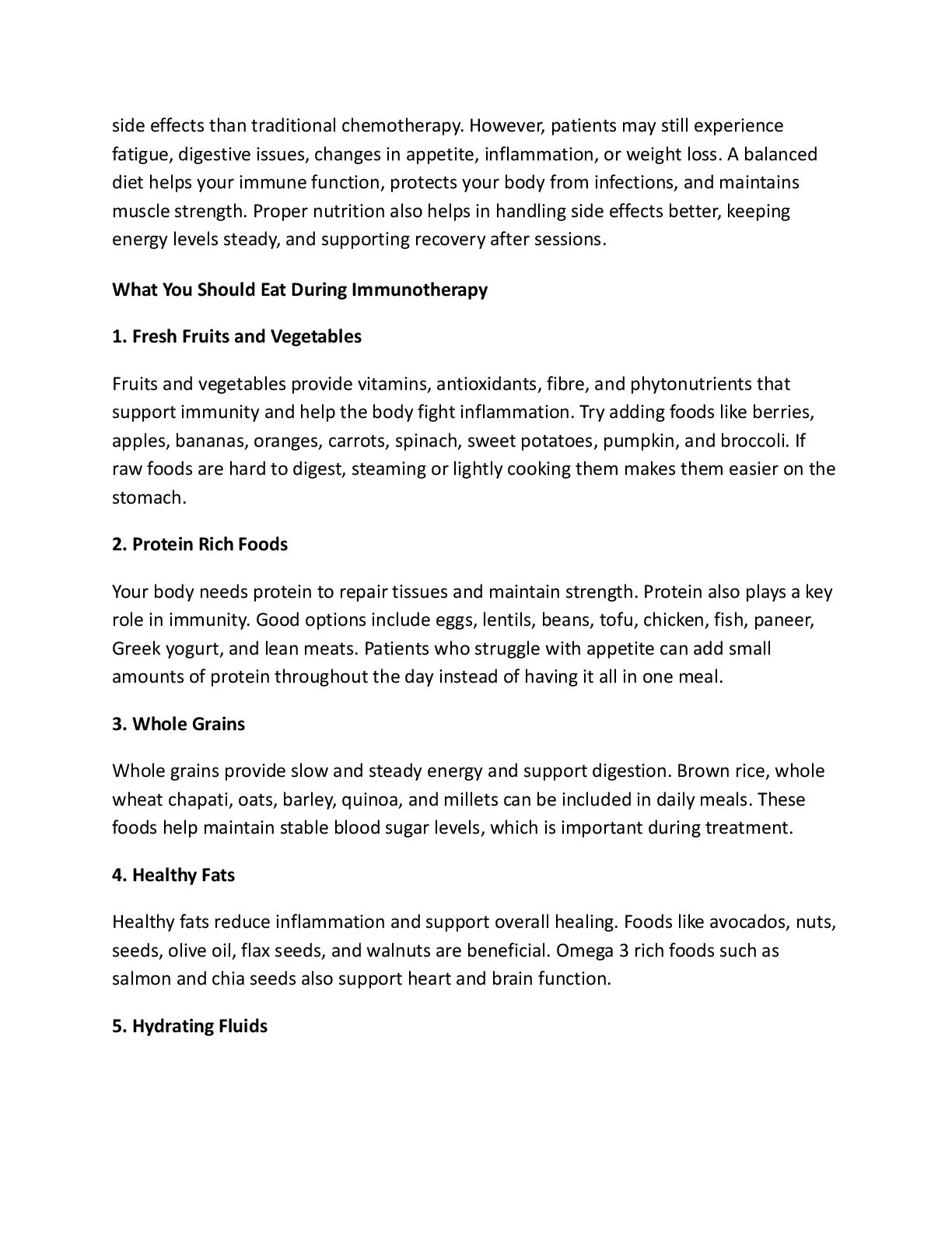 fatigue, digestive issues, changes in appetite, inflammation, or weight loss. A balanced diet helps your immune function, protects your body from infections, and maintains muscle strength. Proper nutrition also helps in handling side effects better, keeping energy levels steady, and supporting recovery after sessions. What You Should Eat During Immunotherapy 1. Fresh Fruits and Vegetables Fruits and vegetables provide vitamins, antioxidants, fibre, and phytonutrients that support immunity and help the body fight inflammation. Try adding foods like berries, apples, bananas, oranges, carrots, spinach, sweet potatoes, pumpkin, and broccoli. If raw foods are hard to digest, steaming or lightly cooking them makes them easier on the stomach. 2. Protein Rich Foods Your body needs protein to repair tissues and maintain strength. Protein also plays a key role in immunity. Good options include eggs, lentils, beans, tofu, chicken, fish, paneer, Greek yogurt, and lean meats. Patients who struggle with appetite can add small amounts of protein throughout the day instead of having it all in one meal. 3. Whole Grains Whole grains provide slow and steady energy and support digestion. Brown rice, whole wheat chapati, oats, barley, quinoa, and millets can be included in daily meals. These foods help maintain stable blood sugar levels, which is important during treatment. 4. Healthy Fats Healthy fats reduce inflammation and support overall healing. Foods like avocados, nuts, seeds, olive oil, flax seeds, and walnuts are beneficial. Omega 3 rich foods such as salmon and chia seeds also support heart and brain function. 5. Hydrating Fluids
