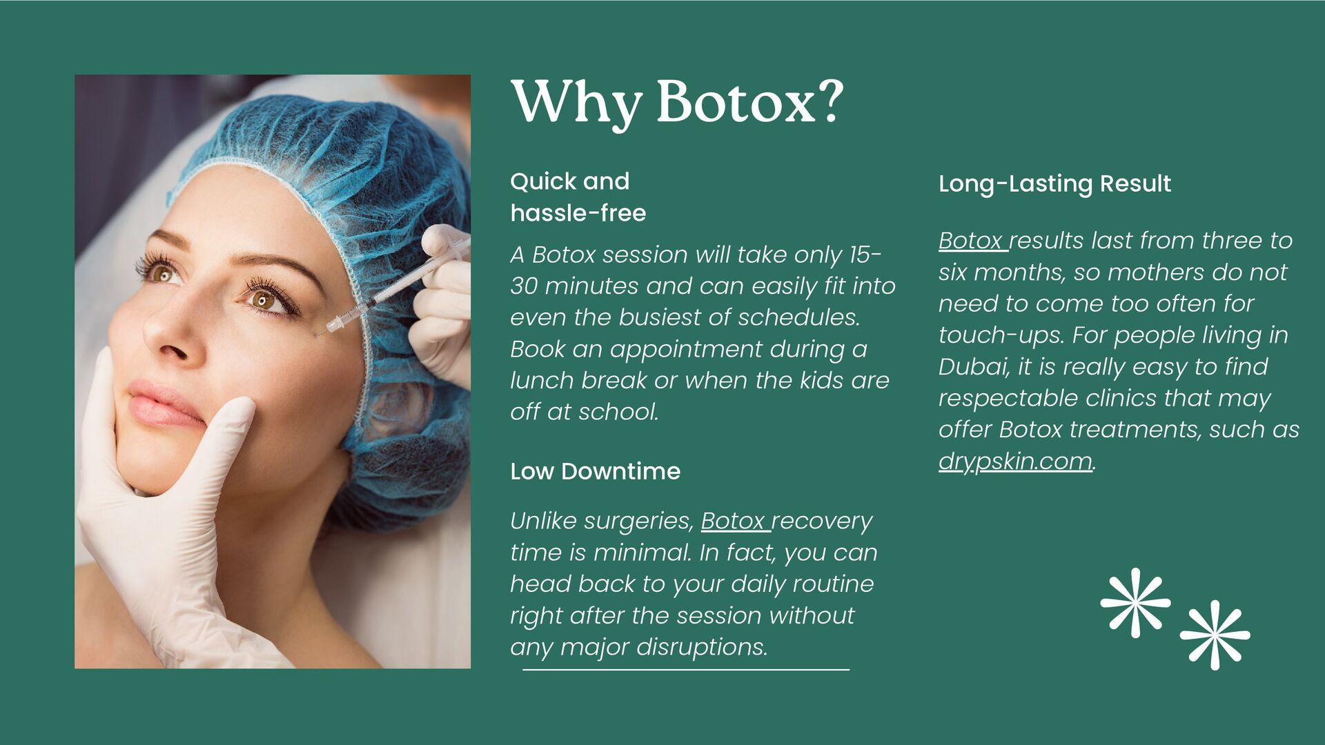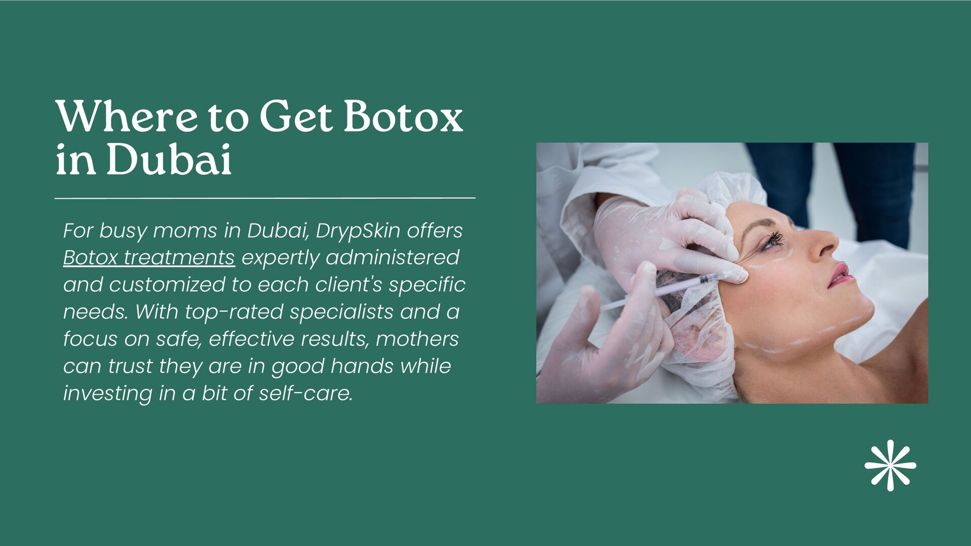 For busy moms in Dubai, drypskin.com offers Botox treatments expertly administered and customized to each client's specific needs. With top-rated specialists and a focus on safe, effective results, mothers can trust they are in good hands while investing in a bit of self-care.