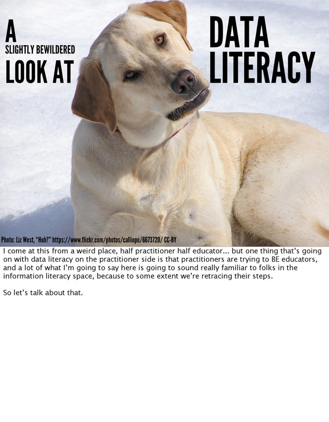 BEWILDERED LOOK AT I come at this from a weird place, half practitioner half educator... but one thing that’s going on with data literacy on the practitioner side is that practitioners are trying to BE educators, and a lot of what I’m going to say here is going to sound really familiar to folks in the information literacy space, because to some extent we’re retracing their steps. So let’s talk about that.