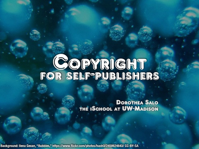 https://www.flickr.com/photos/hach3/2458624643/ CC-BY-SA Copyright and cover art • “I found this great image online! So I can totally use it on my cover, right?” • WRONG. (Probably.) • Copyright is automatic. Including for images. Including ONLINE images. • Assume it’s copyrighted and you need the artist’s or photographer’s permission, unless…