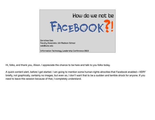 iSchool [email protected] Information Technology Leadership Conference 2019 FACEBOOK?! !1 Hi, folks, and thank you, Alison. I appreciate the chance to be here and talk to you folks today. A quick content alert, before I get started. I am going to mention some human-rights atrocities that Facebook enabled—VERY briefly, not graphically, certainly no images, but even so, I don’t want that to be a sudden and terrible shock for anyone. If you need to leave this session because of that, I completely understand.