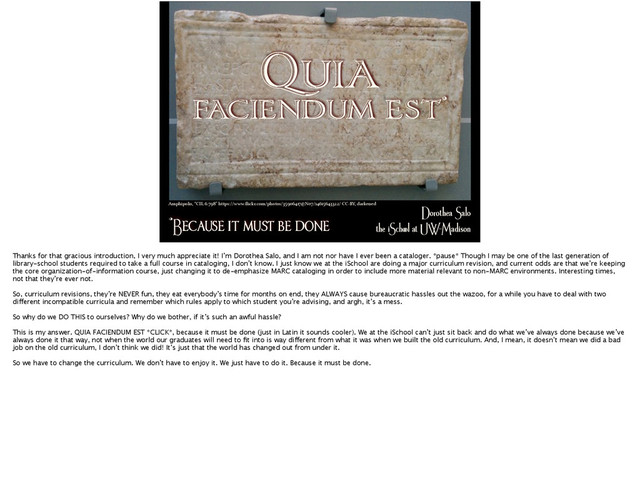 supplement—and again, thank you for this, if anybody’s here from IFLA, this is a classroom life-saver—just to show the difficulties. Try to think like a computer for a second. There’s a WHOLE LOT of punctuation all up in here, and it’s not at all obvious (even to me, and I’m a human being) what’s being set off by it or what it means, or even if it means anything at all! I mean, look at the physical description of the globe there. Tell me what a period, a dot, means there (1 space globe space colon space col dot comma space plastic space semicolon space thirty cm space parenthesis diam dot parenthesis). Oh, okay, as a human being, I can figure out the dots there are calling out abbreviations. Now, can I just tell the computer to assume a dot always means an abbreviation? Of course I can’t! A dot doesn’t mean that in the other areas! And can anybody tell me why in the last area of the globe description, everything except the final sentence has a period at the end? It’s enough to make a computer programmer cry into her beer. And I lopped the area labels off for legibility, but I just want to point out, we have two competing sets of delimiters happening here—the areas, that are set off with whitespace, and what’s in each individual area, which is funky punctuation city. And when you add that to MARC, we’ve got a whole ‘nother set of delimiters in the form of fields, subfields, and indicators. I respect my colleagues who teach cataloging! I could never do it! Because I cut my teeth on XML, where delimiters are totally cut-and-dried and straightforward, such that I find this mishmash completely bewildering! And the bottom example there, anybody see an error? *pause* I mean, I think it’s an error, it’s hard to tell, but that very bottom line, if that’s supposed to be an em dash before the word Canyon, it’s not. To a human being, no big deal. To a computer, VERY big deal. Just goes to show, when we can’t even be sure our documentation is right…