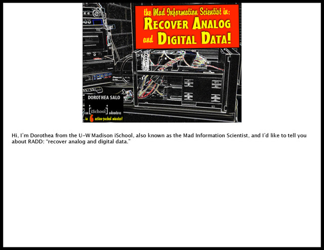 DOROTHEA SALO an adventure in action-packed minutes! 6 Hi, I’m Dorothea from the U-W Madison iSchool, also known as the Mad Information Scientist, and I’d like to tell you about RADD: “recover analog and digital data.”