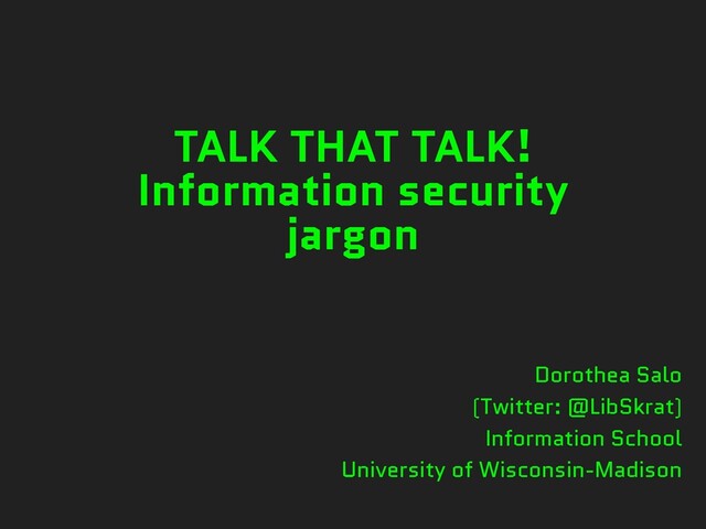 that isn’t broadly understood outside that community ✦ Could be a professional community (as with infosec, or for that matter librarianship), also called a “community of practice” ✦ Could be a community of choice, such as a hobby community ✦ Jargon is not bad! ✦ Can speed up communication, make it more precise ✦ … But jargon can be a barrier to those new to the community. ✦ (Sometimes, it must be said, intentionally.)