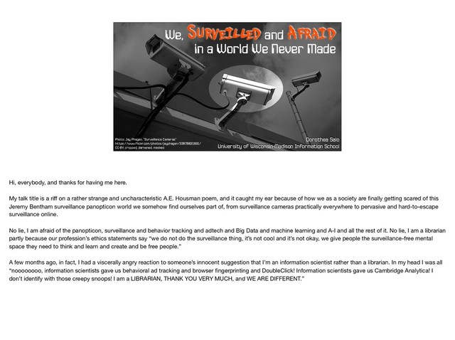 Made Dorothea Salo University of Wisconsin-Madison Information School Photo: Jay Phagan, “Surveillance Cameras” https://www.flickr.com/photos/jayphagan/33870031091/ CC-BY, cropped, darkened, masked Hi, everybody, and thanks for having me here. My talk title is a riff on a rather strange and uncharacteristic A.E. Housman poem, and it caught my ear because of how we as a society are finally getting scared of this Jeremy Bentham surveillance panopticon world we somehow find ourselves part of, from surveillance cameras practically everywhere to pervasive and hard-to-escape surveillance online. No lie, I am afraid of the panopticon, surveillance and behavior tracking and adtech and Big Data and machine learning and A-I and all the rest of it. No lie, I am a librarian partly because our profession’s ethics statements say “we do not do the surveillance thing, it’s not cool and it’s not okay, we give people the surveillance-free mental space they need to think and learn and create and be free people.” A few months ago, in fact, I had a viscerally angry reaction to someone’s innocent suggestion that I’m an information scientist rather than a librarian. In my head I was all “noooooooo, information scientists gave us behavioral ad tracking and browser fingerprinting and DoubleClick! Information scientists gave us Cambridge Analytica! I don’t identify with those creepy snoops! I am a LIBRARIAN, THANK YOU VERY MUCH, and WE ARE DIFFERENT.”