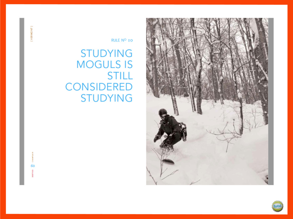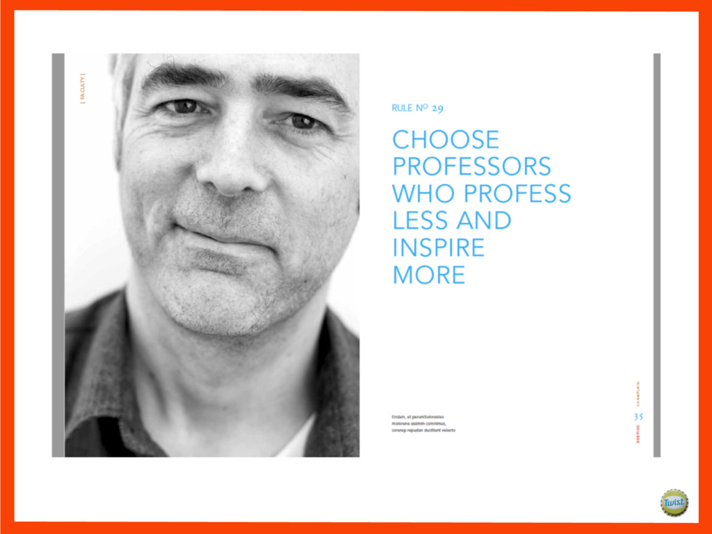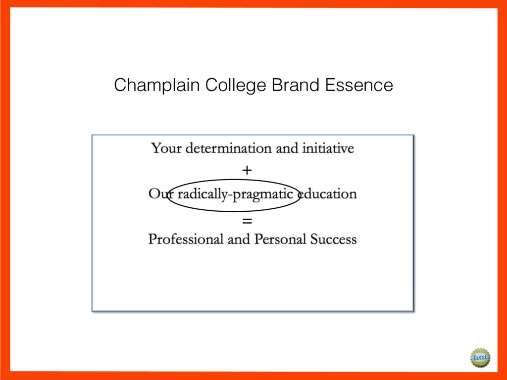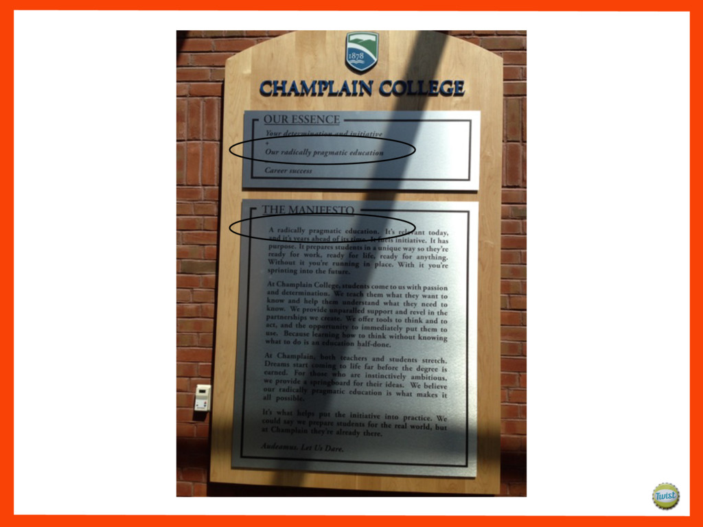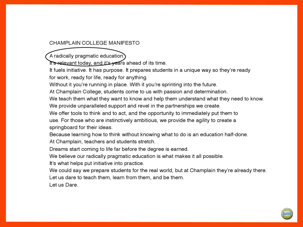 and it’s years ahead of its time. It fuels initiative. It has purpose. It prepares students in a unique way so they’re ready for work, ready for life, ready for anything. Without it you’re running in place. With it you’re sprinting into the future. At Champlain College, students come to us with passion and determination. We teach them what they want to know and help them understand what they need to know. We provide unparalleled support and revel in the partnerships we create. We offer tools to think and to act, and the opportunity to immediately put them to use. For those who are instinctively ambitious, we provide the agility to create a springboard for their ideas. Because learning how to think without knowing what to do is an education half-done. At Champlain, teachers and students stretch. Dreams start coming to life far before the degree is earned. We believe our radically pragmatic education is what makes it all possible. It’s what helps put initiative into practice. We could say we prepare students for the real world, but at Champlain they’re already there. Let us dare to teach them, learn from them, and be them. Let us Dare.