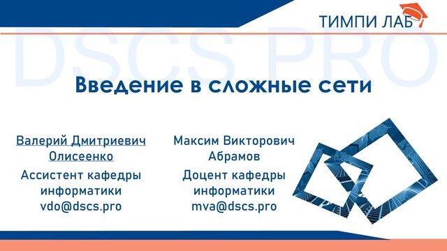 = ||, — рёбра, = ||; • Направленность, простые (без циклов), взвешенность; • Связный, сильно-связный и слабо-связный граф; • Связный компонент — максимально связный подграф; • Путь — последовательность рёбер, которые соединяют некую последовательность узлов (простой путь, без циклов); • Геодезическое расстояние — кратчайший путь между двумя узлами; • Средний кратчайший путь (цепочка, звезда, полный); • Диаметр графа — наибольшее кратчайшее расстояние (два узла, отстоящие дальше всех друг от друга); • Степень узла — количество ближайших соседей; • Распределение степеней узлов ().