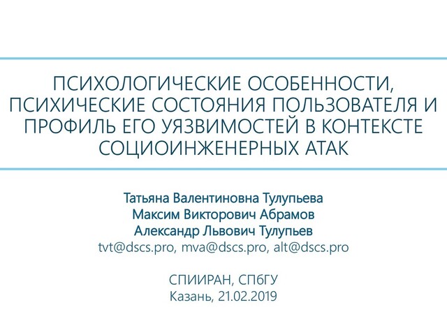 атаки: социальные сети и оценки защищенности пользователей. СПб.: ГУАП, 2018. 266 с. ISBN 978-5-8088-1377-5 • Suleimanov A., Abramov M., Tulupyev A. Modelling of the social engineering attacks based on social graph of employees communications analysis // Proceedings of 2018 IEEE Industrial Cyber-Physical Systems (ICPS). St.-Petersburg. 2018. P. 801–805. DOI: 10.1109/ICPHYS.2018.8390809 • Фролова А.Н., Тулупьева Т.В., Пащенко А.Е., Тулупьев А.Л. Возможный подход к анализу защищенности информационных систем от социоинженерных атак // Информационная безопасность регионов России (ИБРР–2007). V Санкт-Петербургская региональная конференция. Санкт-Петербург, 23–25 октября 2007 г.: Труды конференции / СПОИСУ. СПб., 2008. С. 195–199. • Фролова А.Н., Пащенко А.Е., Тулупьева Т.В., Тулупьев А.Л. Анализ уровня защищенности информационных систем в контексте социоинженерных атак: постановка проблемы // Труды СПИИРАН. 2008. №. 7. С. 170–176. • Азаров А.А., Тулупьева Т.В., Суворова А.В., Тулупьев А.Л., Абрамов М.В., Юсупов Р.М. Социоинженерные атаки. Проблемы анализа. СПб.: Наука, 2016. 352 с. ISBN 978-5-02- 039592-3 • Хлобыстова А.О., Абрамов М.В., Тулупьев А.Л., Золотин А.А. Поиск кратчайшей траектории социоинженерной атаки между парой пользователей в графе с вероятностями переходов // Информационно-управляющие системы. 2018. № 6. С. 74–81. doi:10.31799/1684-8853- 2018-6-74-81