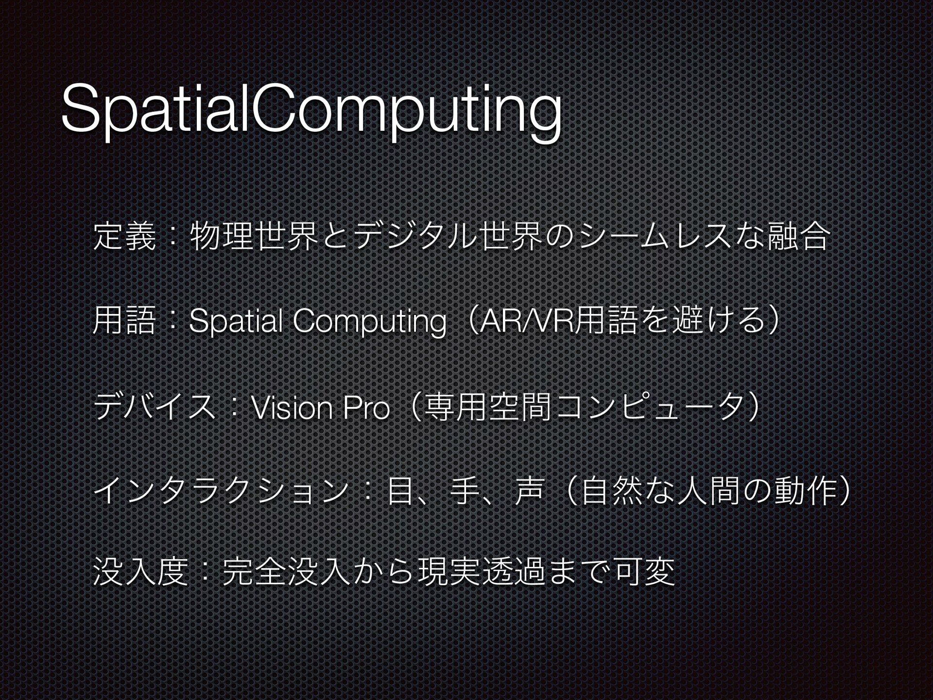 SpatialComputing ఆٛɿཧੈքͱσδλϧੈքͷγʔϜϨεͳ༥߹ ༻ޠɿSpatial ComputingʢAR/VR༻ޠΛආ͚Δʣ σόΠεɿVision Proʢઐ༻ۭؒίϯϐϡʔλʣ ΠϯλϥΫγϣϯɿɺखɺʢࣗવͳਓؒͷಈ࡞ʣ ೖɿશೖ͔Βݱ࣮ಁա·ͰՄม