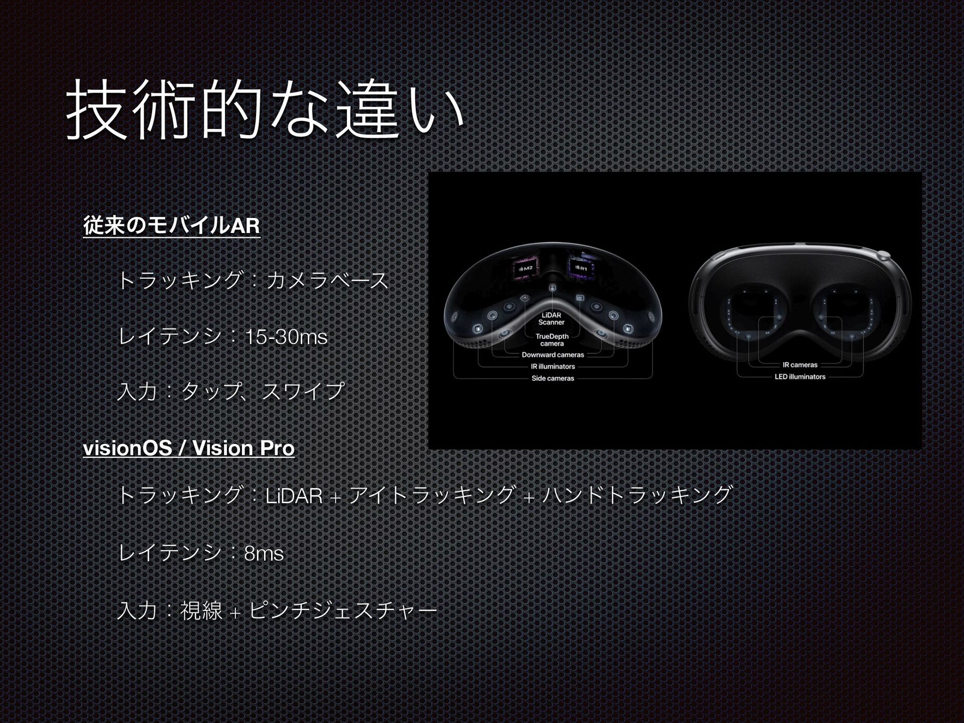 ٕज़తͳҧ͍ ैདྷͷϞόΠϧAR τϥοΩϯάɿΧϝϥϕʔε ϨΠςϯγɿ15-30ms ೖྗɿλοϓɺεϫΠϓ visionOS / Vision Pro τϥοΩϯάɿLiDAR