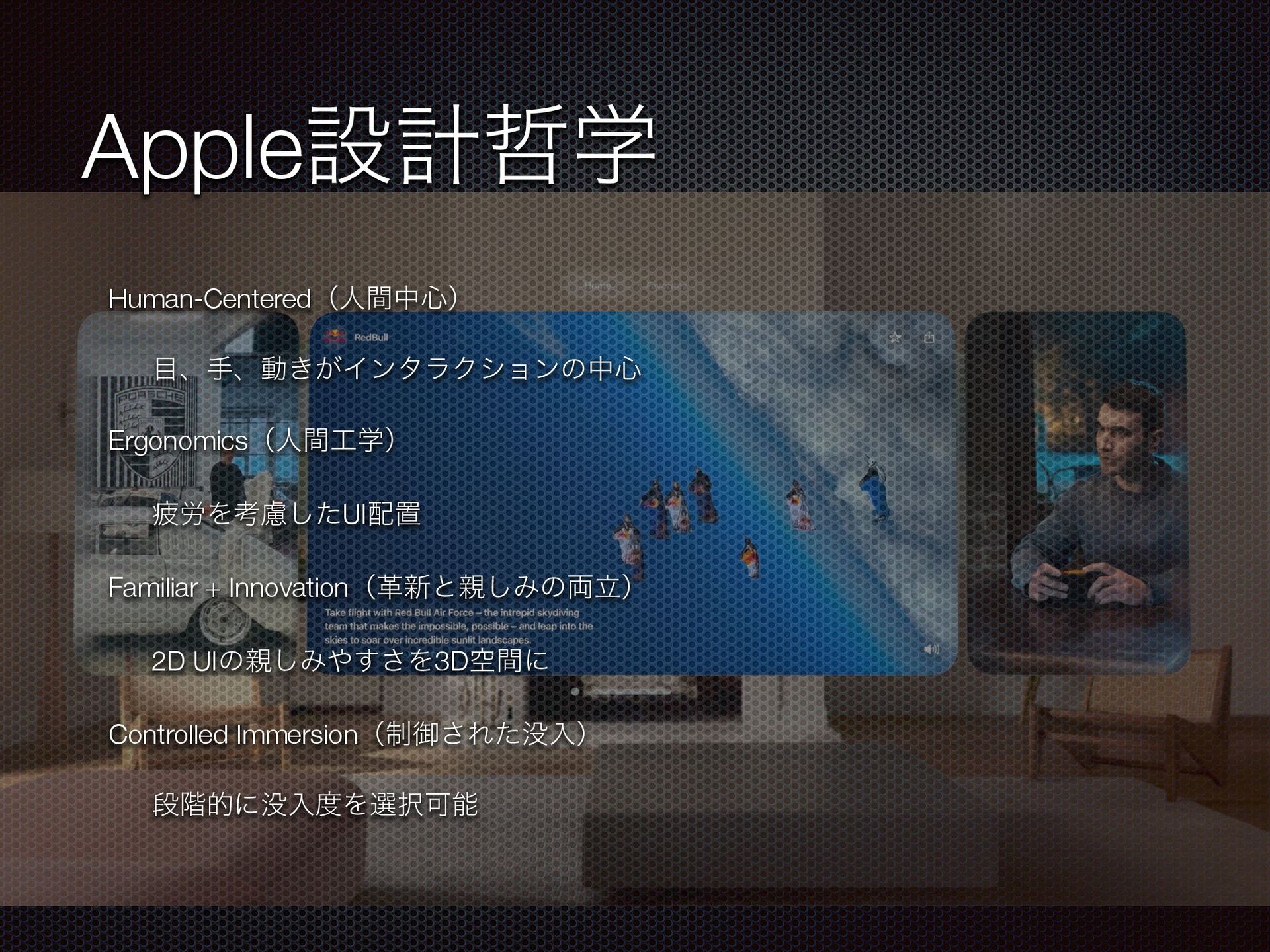 Appleઃܭֶ Human-Centeredʢਓؒத৺ʣ ɺखɺಈ͖͕ΠϯλϥΫγϣϯͷத৺ Ergonomicsʢਓֶؒʣ ർ࿑Λߟྀͨ͠UIஔ Familiar + Innovationʢֵ৽ͱ͠Έͷཱ྆ʣ 2D UIͷ͠Έ͢͞Λ3Dۭؒʹ