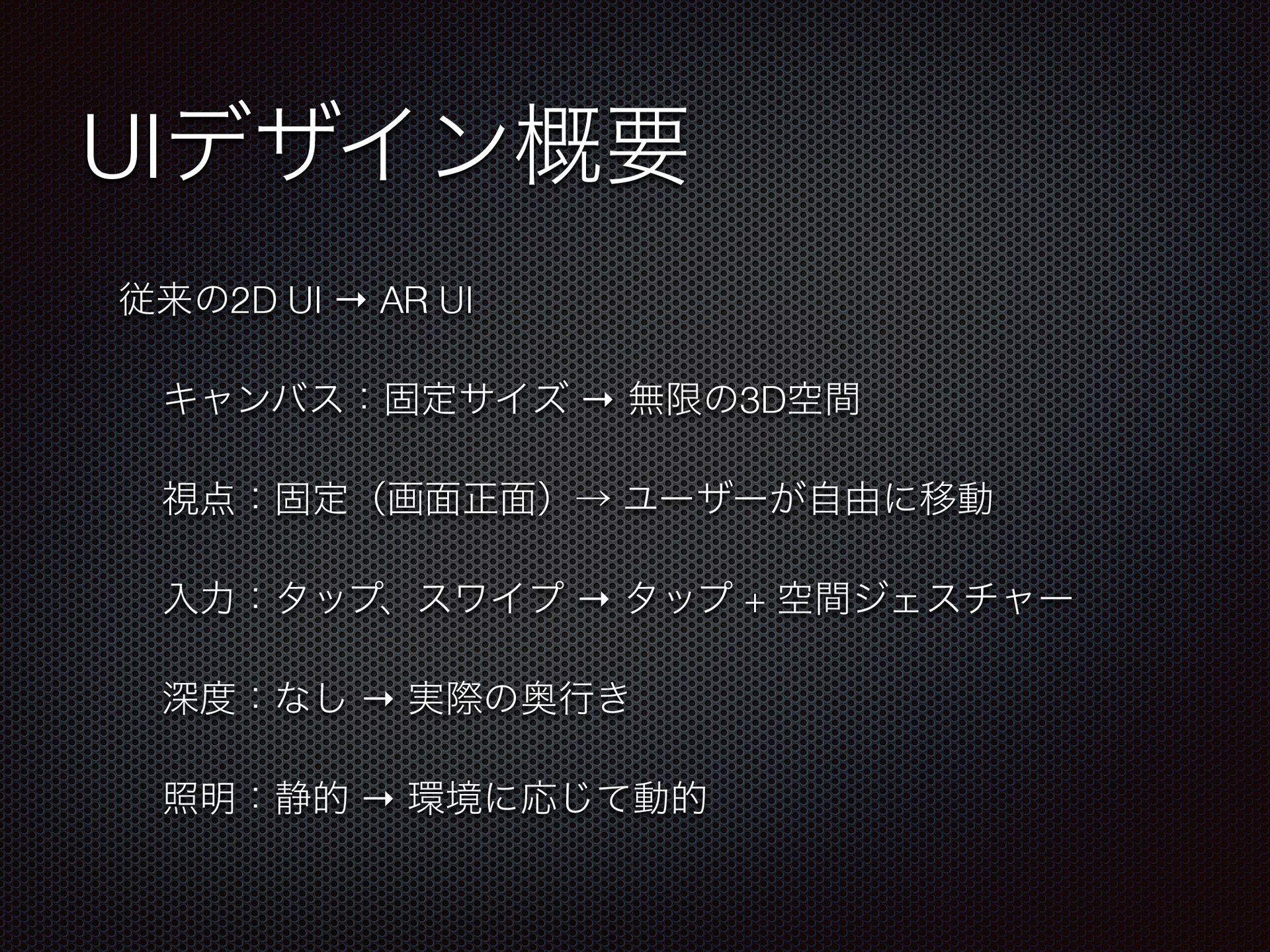 UIσβΠϯ֓ཁ ैདྷͷ2D UI → AR UI ΩϟϯόεɿݻఆαΠζ → ແݶͷ3Dۭؒ ࢹɿݻఆʢը໘ਖ਼໘ʣˠ