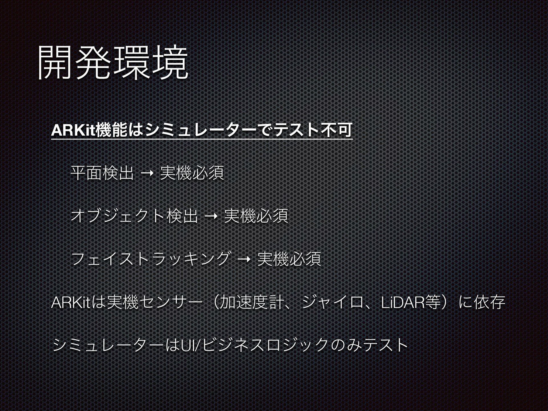 ։ൃڥ ARKitػೳγϛϡϨʔλʔͰςετෆՄ ฏ໘ݕग़ → ࣮ػඞਢ ΦϒδΣΫτݕग़ → ࣮ػඞਢ ϑΣΠετϥοΩϯά →