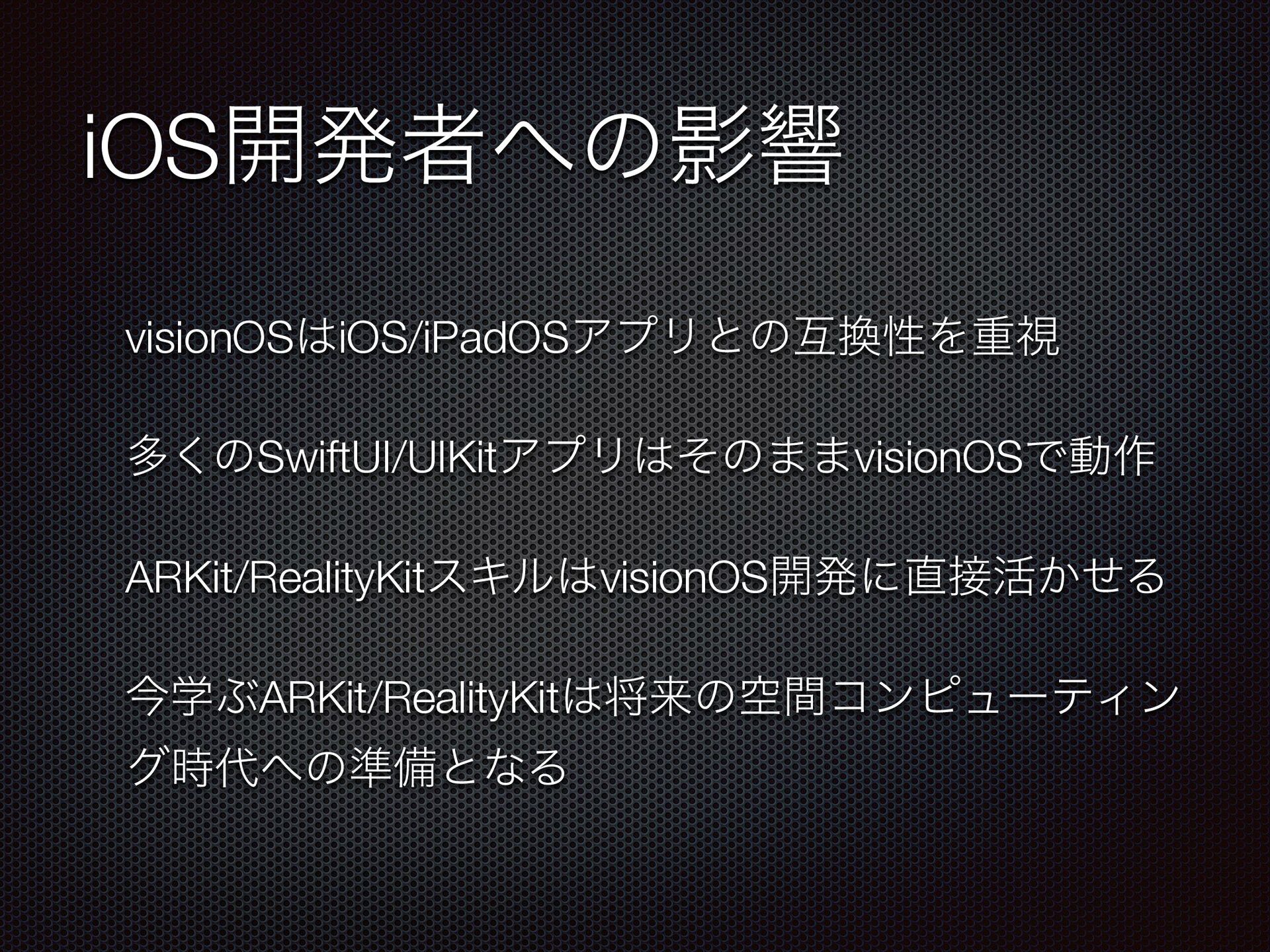 iOS։ൃऀͷӨڹ visionOSiOS/iPadOSΞϓϦͱͷޓੑΛॏࢹ ଟ͘ͷSwiftUI/UIKitΞϓϦͦͷ··visionOSͰಈ࡞ ARKit/RealityKitεΩϧvisionOS։ൃʹ׆͔ͤΔ ࠓֶͿARKit/RealityKitকདྷͷۭؒίϯϐϡʔςΟϯ ά࣌ͷ४උͱͳΔ