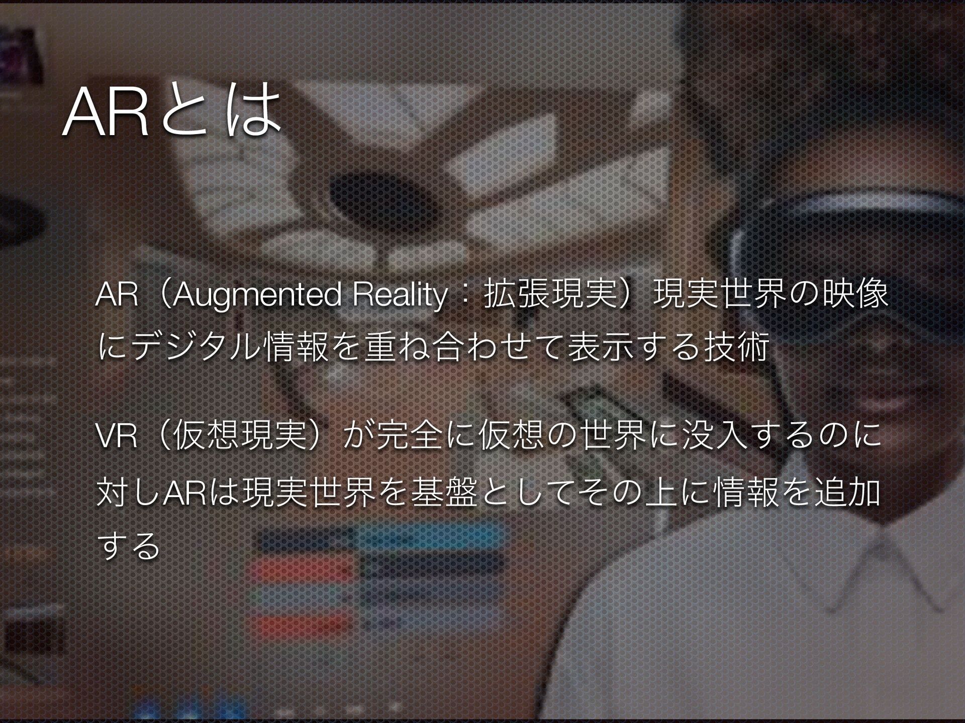 ARͱ ARʢAugmented Realityɿ֦ுݱ࣮ʣݱ࣮ੈքͷө૾ ʹσδλϧใΛॏͶ߹Θͤͯදࣔ͢Δٕज़ VRʢԾݱ࣮ʣ͕શʹԾͷੈքʹೖ͢Δͷʹ ର͠ARݱ࣮ੈքΛج൫ͱͯͦ͠ͷ্ʹใΛՃ ͢Δ