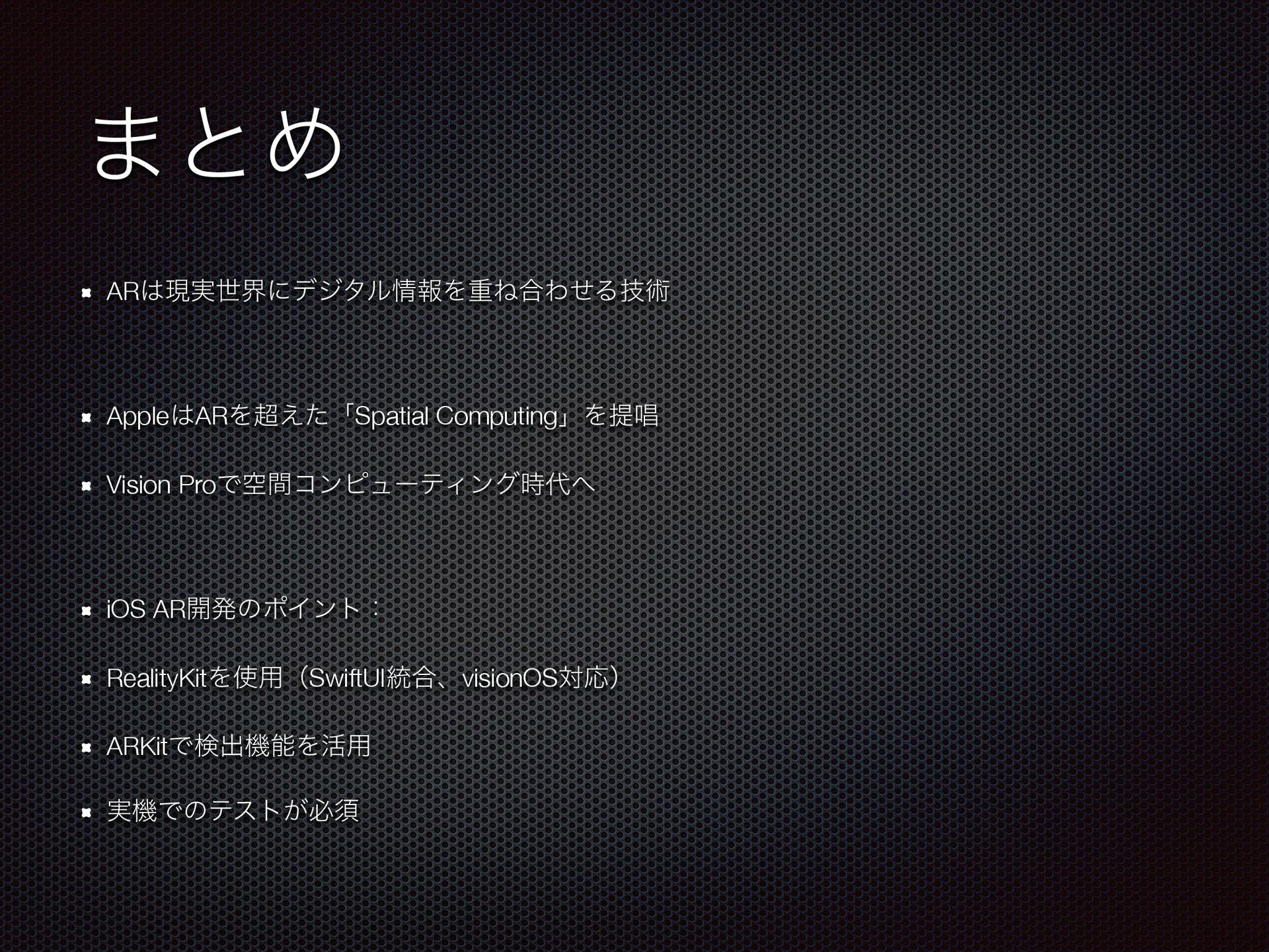 ·ͱΊ ARݱ࣮ੈքʹσδλϧใΛॏͶ߹ΘͤΔٕज़ AppleARΛ͑ͨʮSpatial ComputingʯΛఏএ Vision ProͰۭؒίϯϐϡʔςΟϯά࣌ iOS AR։ൃͷϙΠϯτɿ RealityKitΛ༻ʢSwiftUI౷߹ɺvisionOSରԠʣ ARKitͰݕग़ػೳΛ׆༻