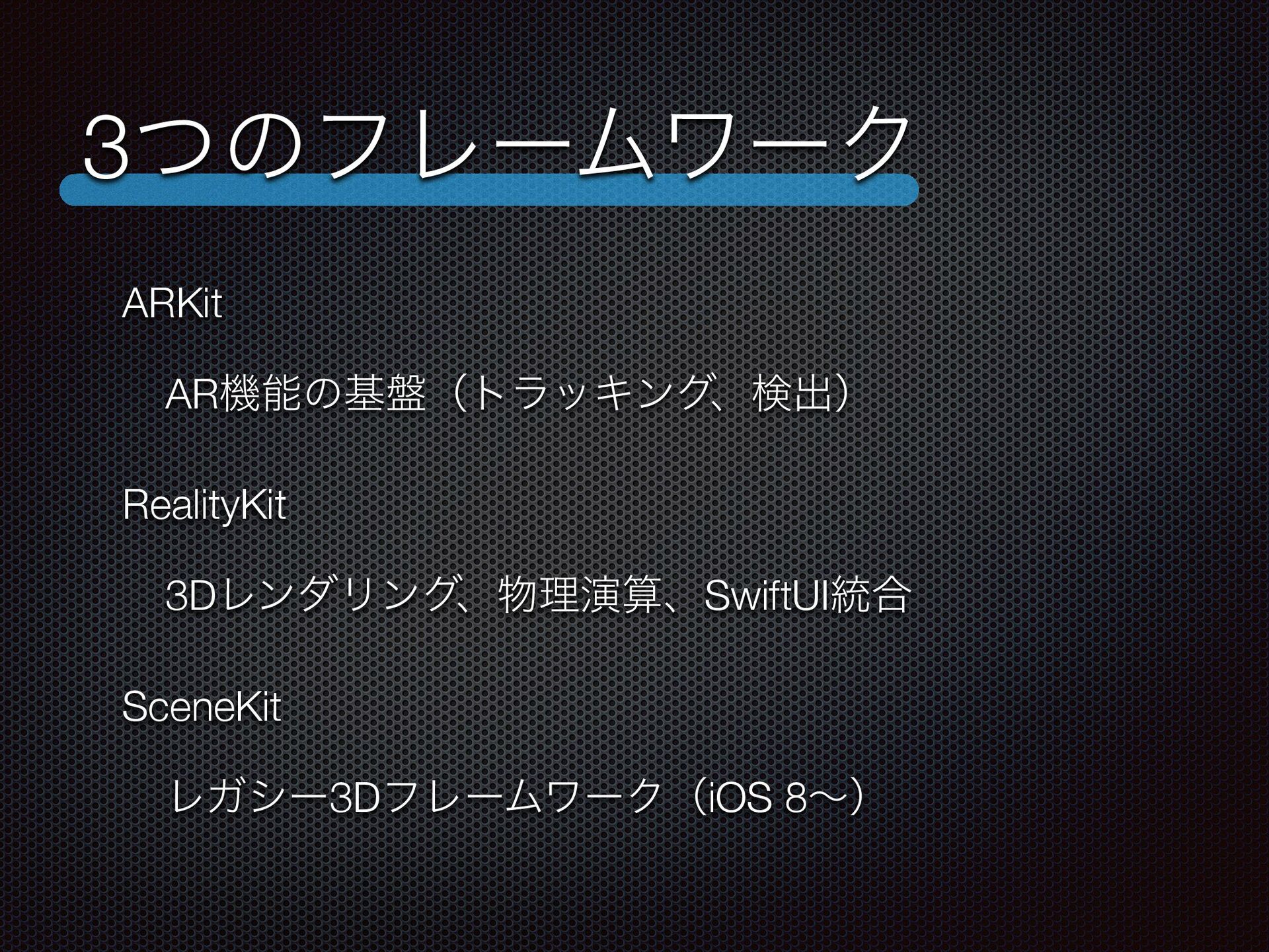 3ͭͷϑϨʔϜϫʔΫ ARKit ARػೳͷج൫ʢτϥοΩϯάɺݕग़ʣ RealityKit 3DϨϯμϦϯάɺཧԋࢉɺSwiftUI౷߹ SceneKit ϨΨγʔ3DϑϨʔϜϫʔΫʢiOS 8ʙʣ