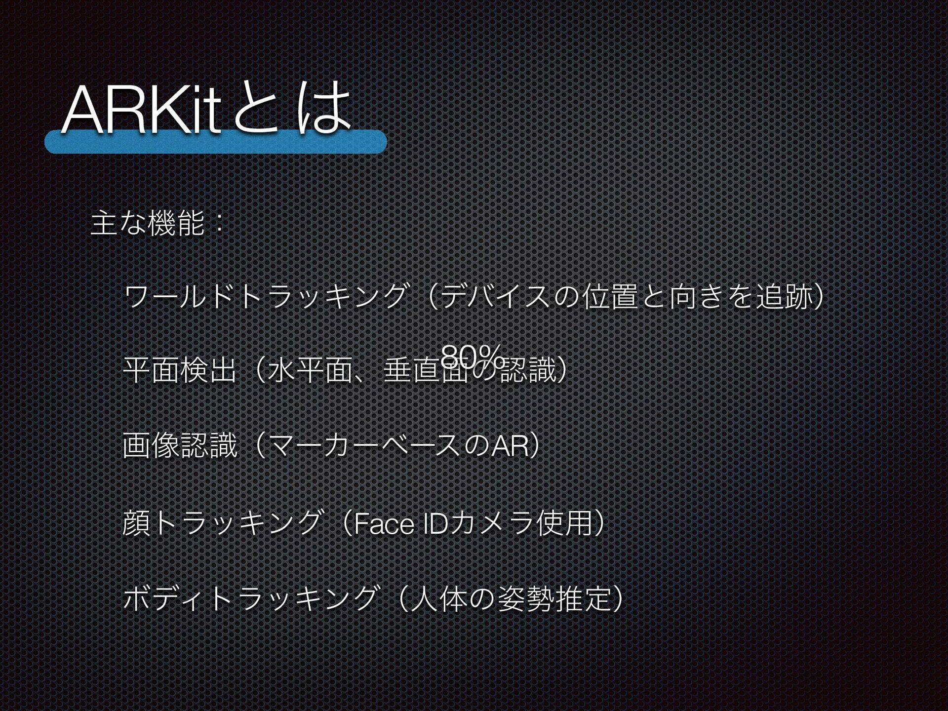ARKitͱ ओͳػೳɿ ϫʔϧυτϥοΩϯάʢσόΠεͷҐஔͱ͖Λʣ ฏ໘ݕग़ʢਫฏ໘ɺਨ໘ͷೝࣝʣ ը૾ೝࣝʢϚʔΧʔϕʔεͷARʣ إτϥοΩϯάʢFace IDΧϝϥ༻ʣ ϘσΟτϥοΩϯάʢਓମͷ࢟ਪఆʣ 80%