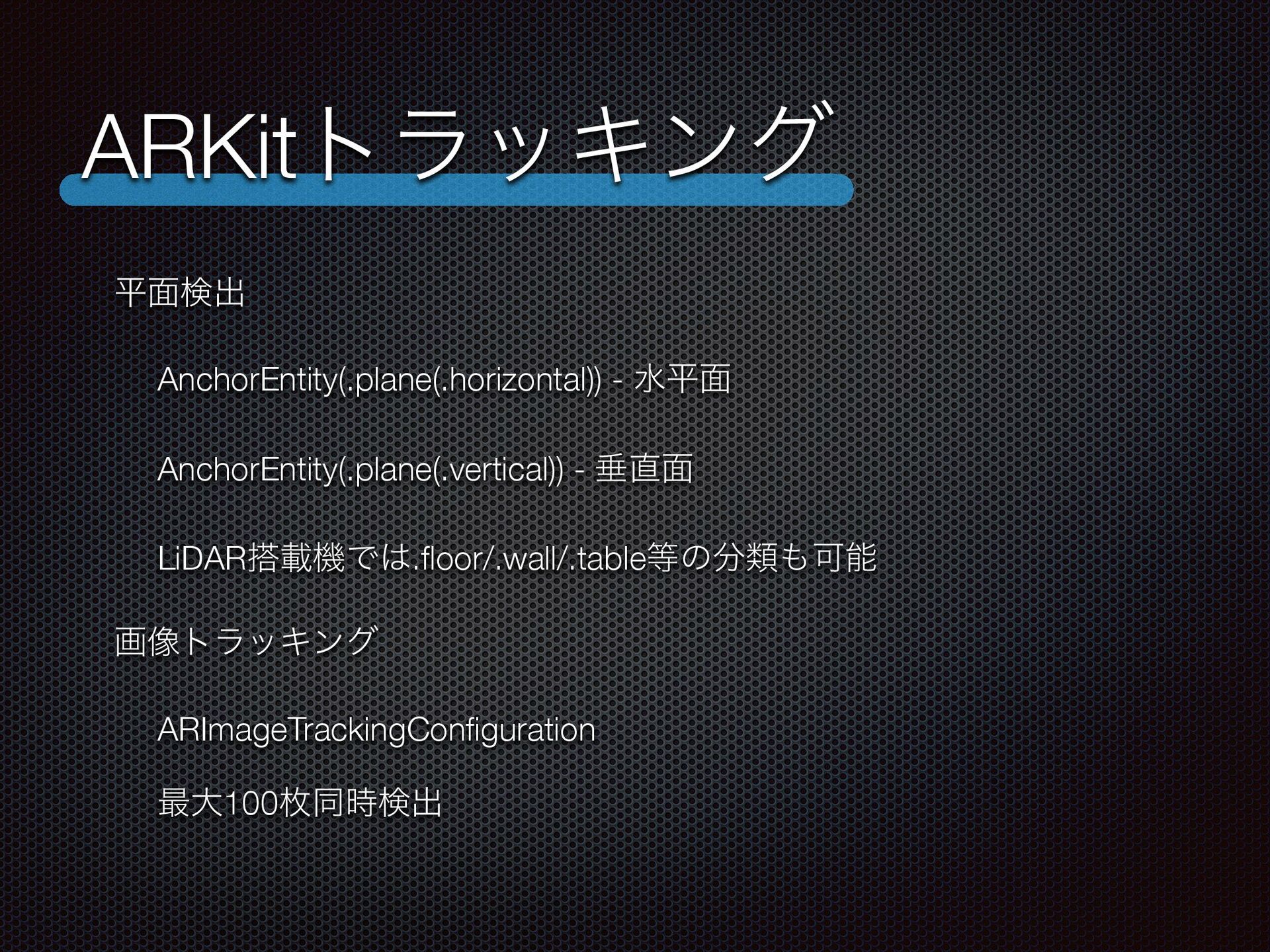 ARKitτϥοΩϯ グ ฏ໘ݕग़ AnchorEntity(.plane(.horizontal)) - ਫฏ໘ AnchorEntity(.plane(.vertical)) - ਨ໘ LiDARࡌػͰ.