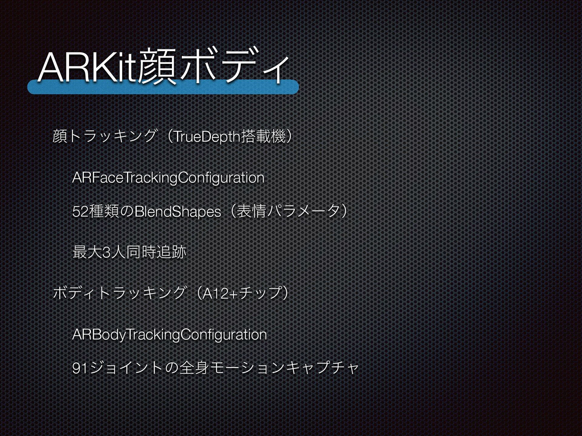ARKitإϘσΟ إτϥοΩϯάʢTrueDepthࡌػʣ ARFaceTrackingCon fi guration 52छྨͷBlendShapesʢදύϥϝʔλʣ ࠷େ3ਓಉ࣌ ϘσΟτϥοΩϯάʢA12+νοϓʣ ARBodyTrackingCon fi
