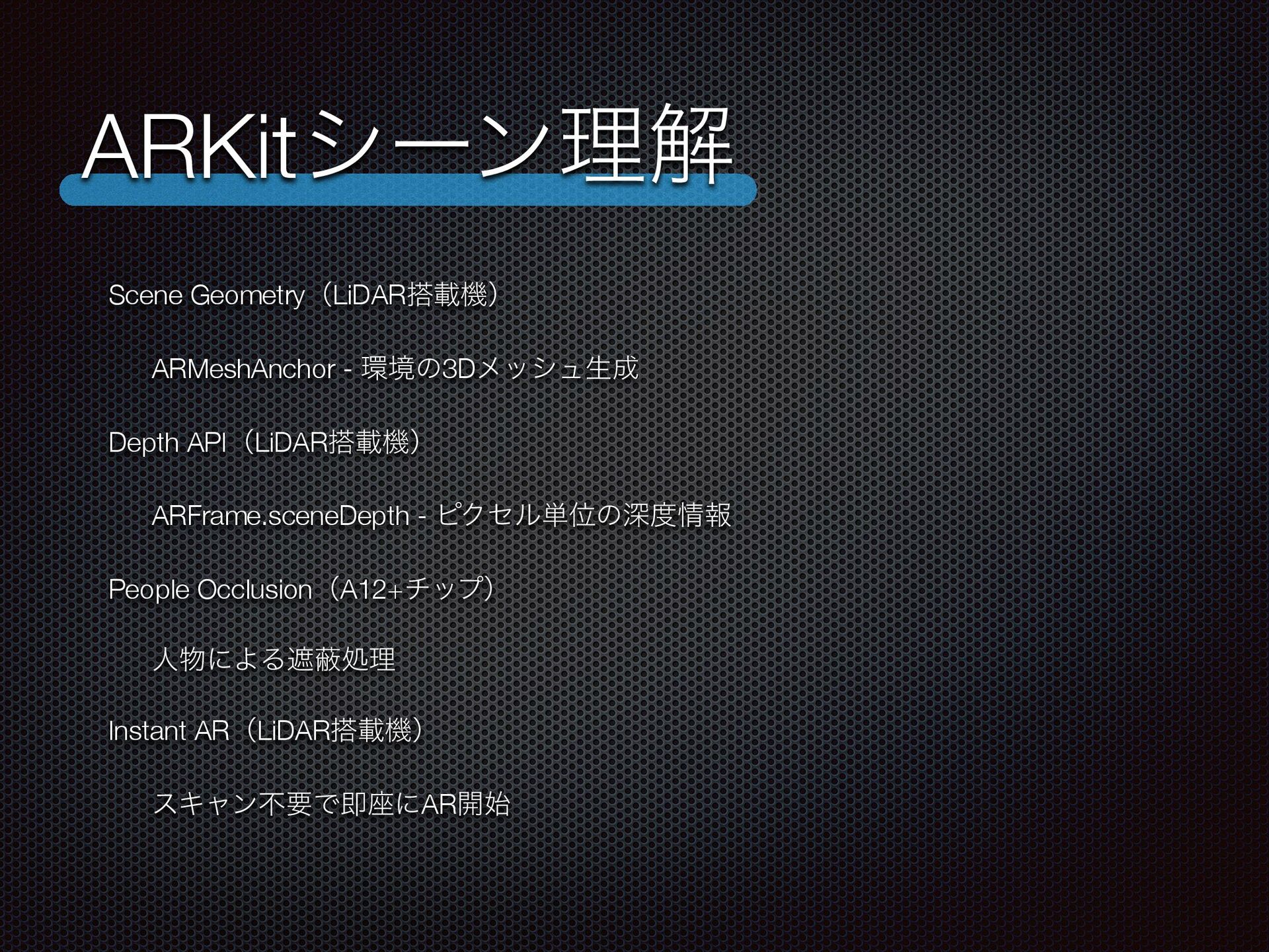 ARKitγʔϯཧղ Scene GeometryʢLiDARࡌػʣ ARMeshAnchor - ڥͷ3Dϝογϡੜ Depth APIʢLiDARࡌػʣ ARFrame.sceneDepth -