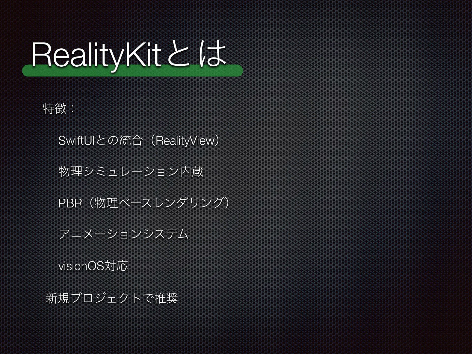 RealityKitͱ ಛɿ SwiftUIͱͷ౷߹ʢRealityViewʣ ཧγϛϡϨʔγϣϯଂ PBRʢཧϕʔεϨϯμϦϯάʣ ΞχϝʔγϣϯγεςϜ visionOSରԠ ৽نϓϩδΣΫτͰਪ