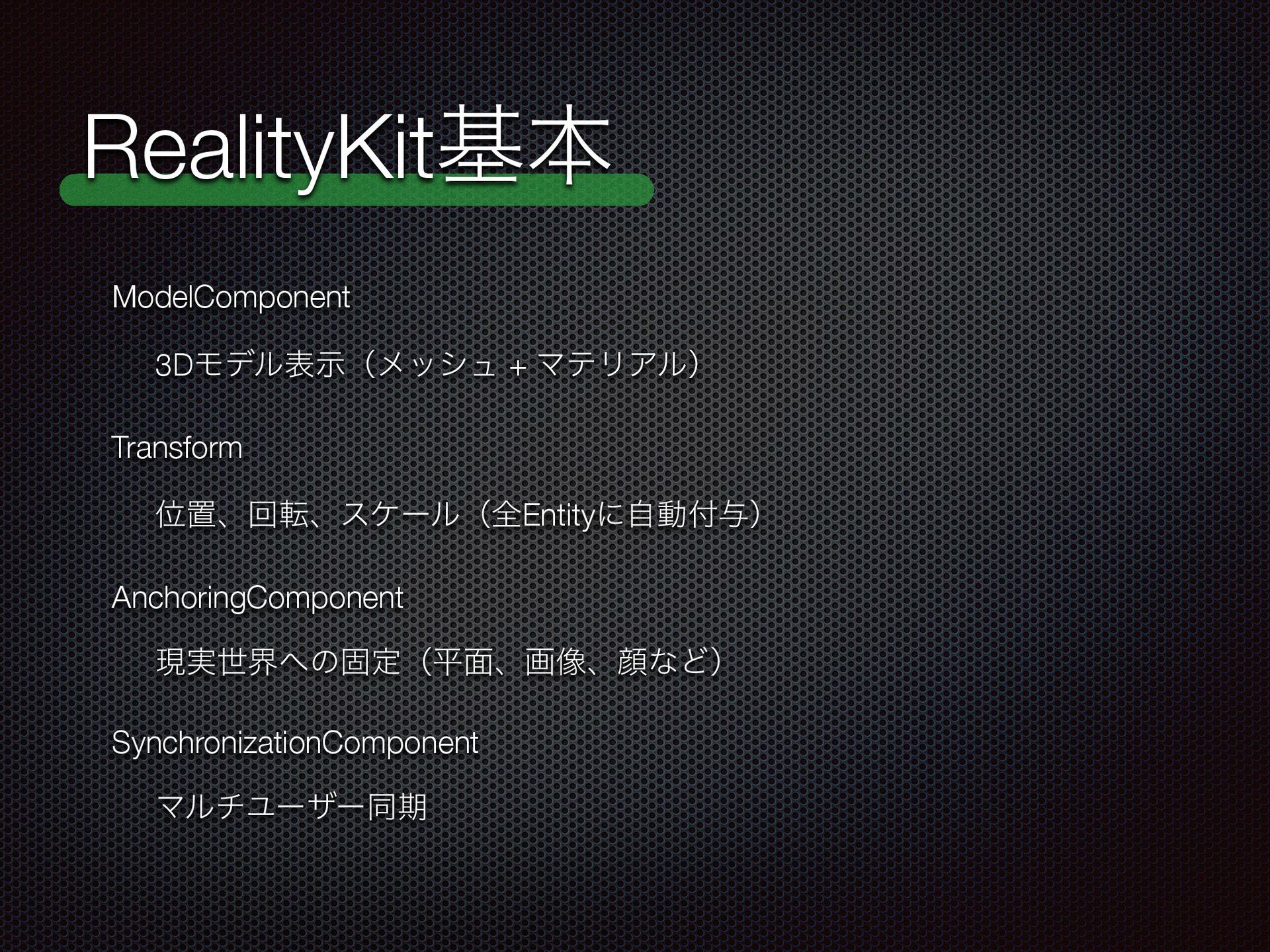 RealityKitجຊ ModelComponent 3DϞσϧදࣔʢϝογϡ + ϚςϦΞϧʣ Transform ҐஔɺճసɺεέʔϧʢશEntityʹࣗಈ༩ʣ AnchoringComponent ݱ࣮ੈքͷݻఆʢฏ໘ɺը૾ɺإͳͲʣ SynchronizationComponent
