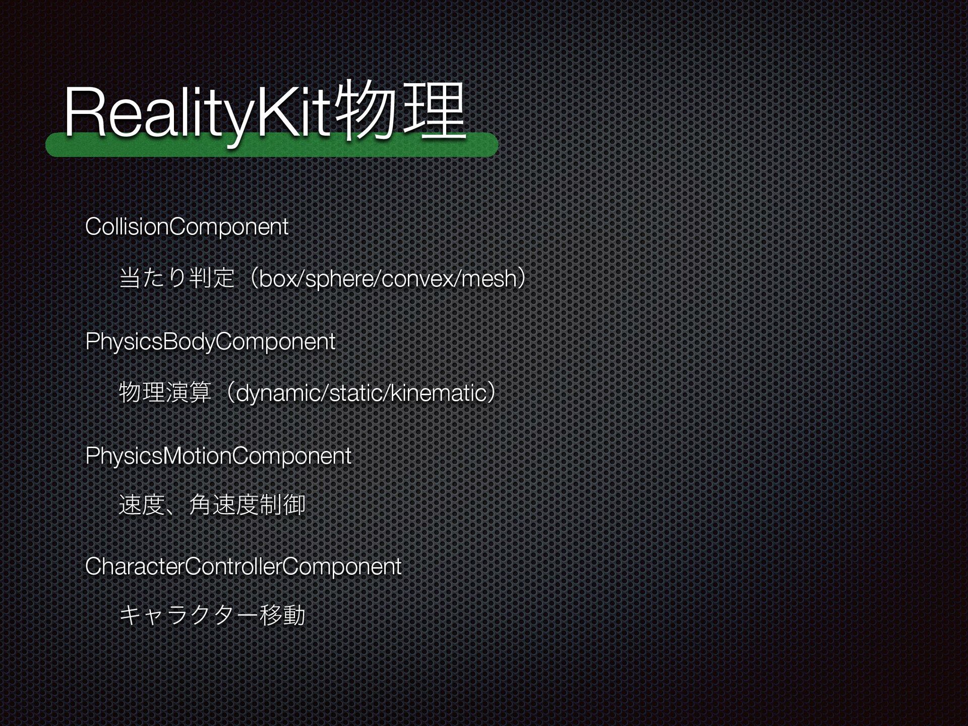 RealityKitཧ CollisionComponent ͨΓఆʢbox/sphere/convex/meshʣ PhysicsBodyComponent ཧԋࢉʢdynamic/static/kinematicʣ PhysicsMotionComponent ɺ੍֯ޚ CharacterControllerComponent ΩϟϥΫλʔҠಈ