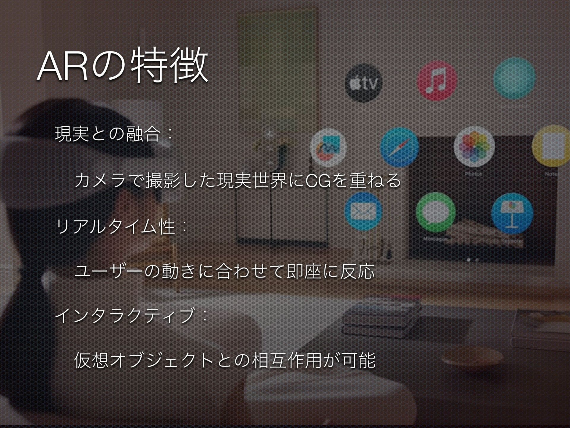 ARͷಛ ݱ࣮ͱͷ༥߹ɿ ΧϝϥͰࡱӨͨ͠ݱ࣮ੈքʹCGΛॏͶΔ ϦΞϧλΠϜੑɿ Ϣʔβʔͷಈ͖ʹ߹Θͤͯଈ࠲ʹԠ ΠϯλϥΫςΟϒɿ ԾΦϒδΣΫτͱͷ૬ޓ࡞༻͕Մೳ