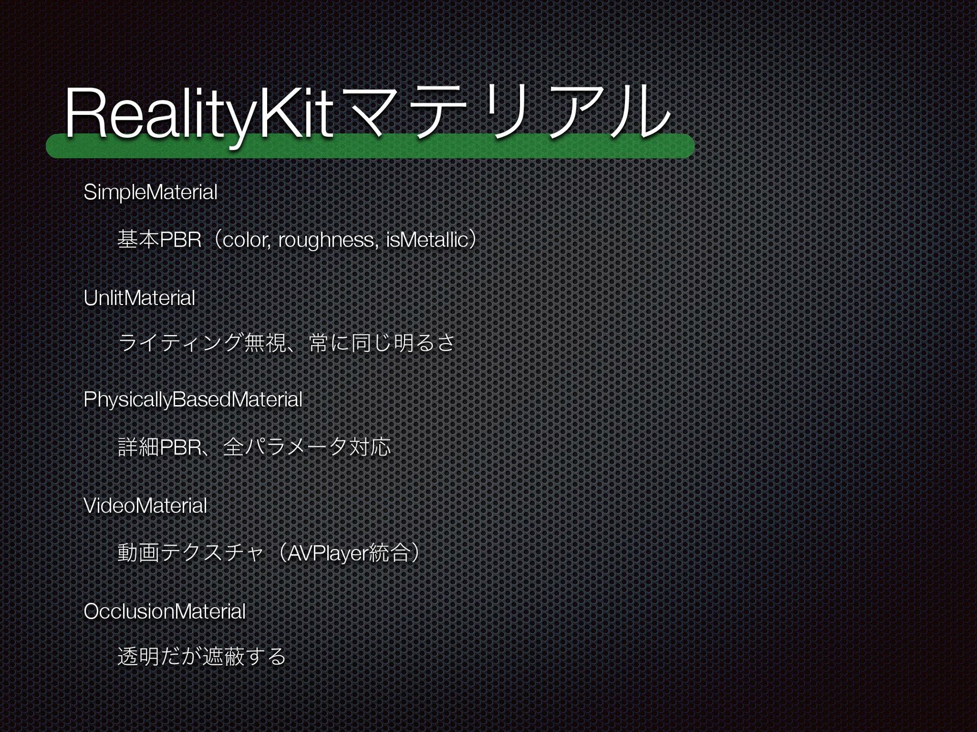 RealityKitϚςϦΞϧ SimpleMaterial جຊPBRʢcolor, roughness, isMetallicʣ UnlitMaterial ϥΠςΟϯάແࢹɺৗʹಉ͡໌Δ͞ PhysicallyBasedMaterial ৄࡉPBRɺશύϥϝʔλରԠ VideoMaterial
