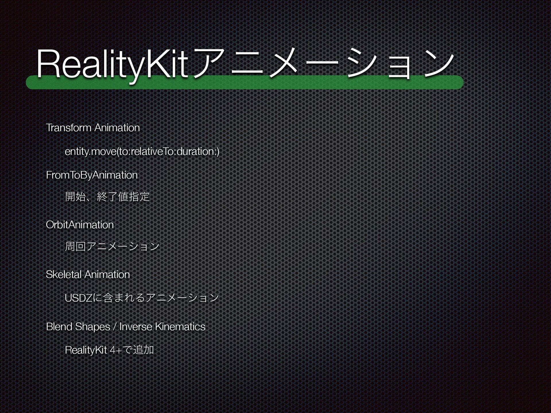 RealityKitΞχϝʔγϣϯ Transform Animation entity.move(to:relativeTo:duration:) FromToByAnimation ։࢝ɺऴྃࢦఆ OrbitAnimation पճΞχϝʔγϣϯ Skeletal Animation