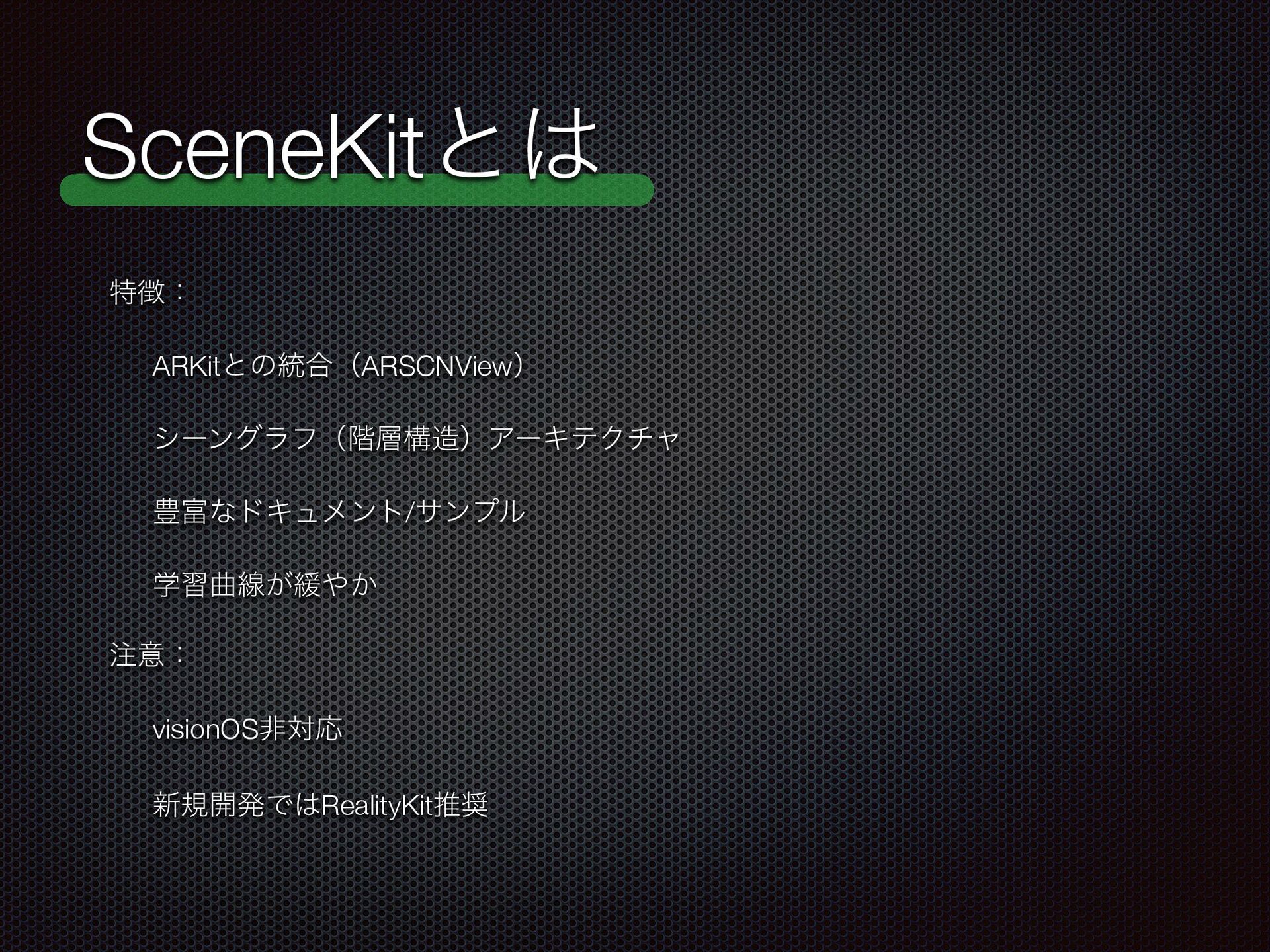 SceneKitͱ ಛɿ ARKitͱͷ౷߹ʢARSCNViewʣ γʔϯάϥϑʢ֊ߏʣΞʔΩςΫνϟ ๛ͳυΩϡϝϯτ/αϯϓϧ ֶशۂઢ͕؇͔ ҙɿ visionOSඇରԠ ৽ن։ൃͰRealityKitਪ
