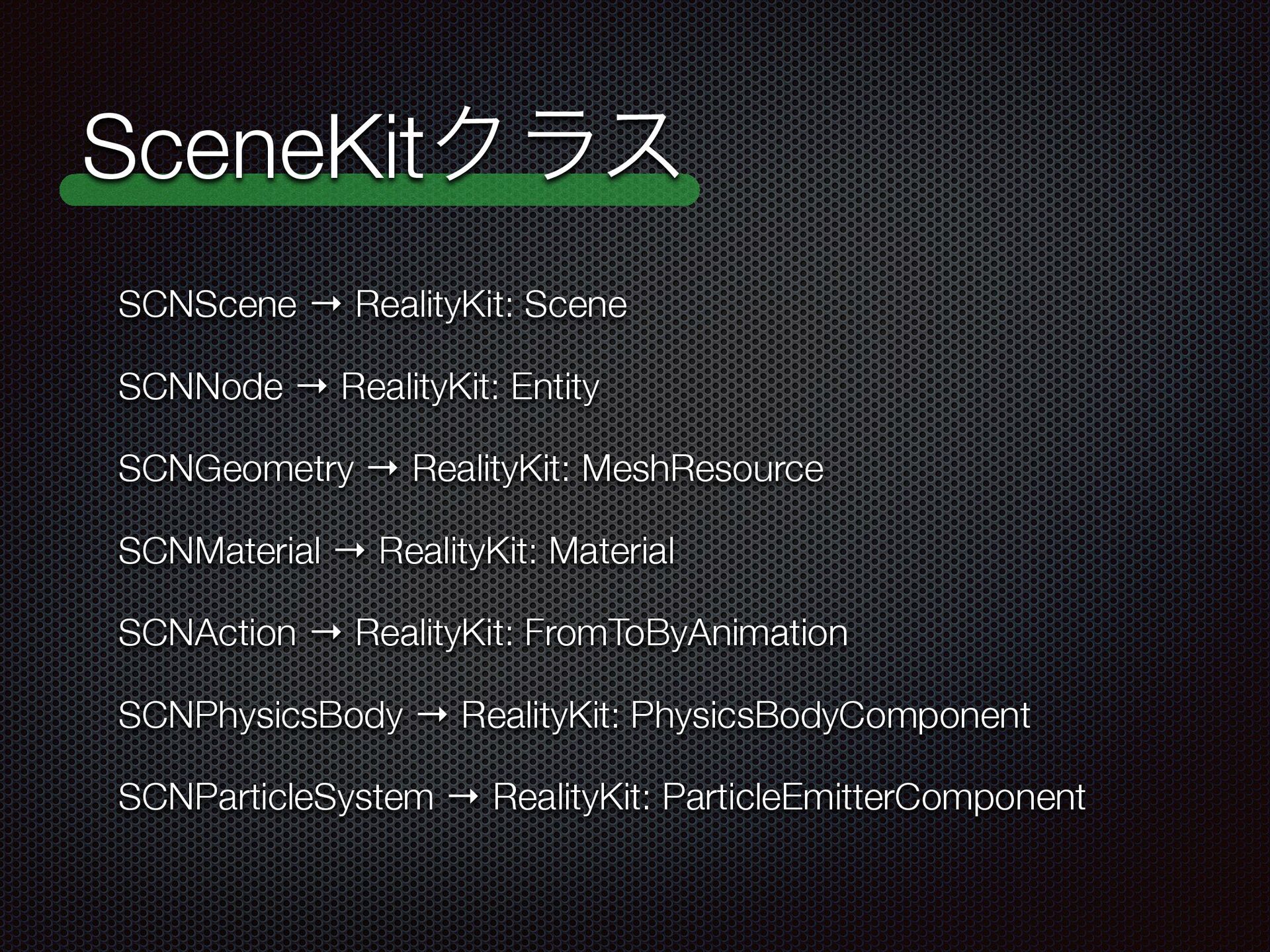 SceneKitΫϥε SCNScene → RealityKit: Scene SCNNode → RealityKit: Entity SCNGeometry
