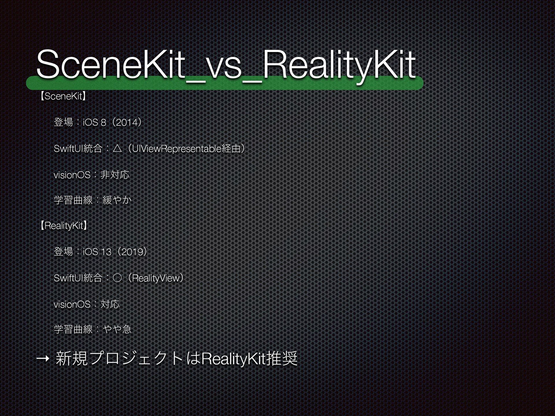 SceneKit_vs_RealityKit ʲSceneKitʳ ొɿiOS 8ʢ2014ʣ SwiftUI౷߹ɿ˚ʢUIViewRepresentableܦ༝ʣ visionOSɿඇରԠ ֶशۂઢɿ؇͔ ʲRealityKitʳ ొɿiOS 13ʢ2019ʣ