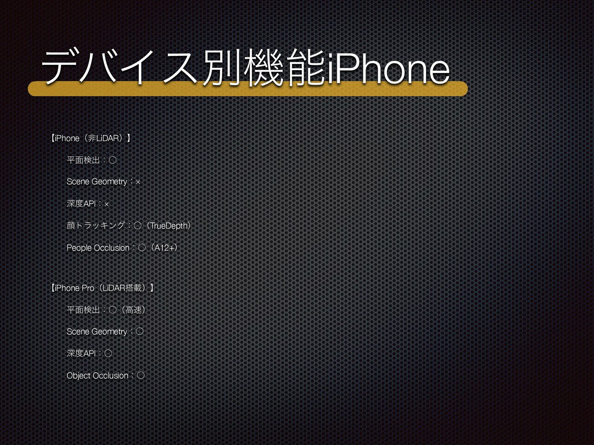 σόΠεผػೳiPhone ʲiPhoneʢඇLiDARʣʳ ฏ໘ݕग़ɿ˓ Scene Geometryɿ× ਂAPIɿ× إτϥοΩϯάɿ˓ʢTrueDepthʣ People Occlusionɿ˓ʢA12+ʣ ʲiPhone