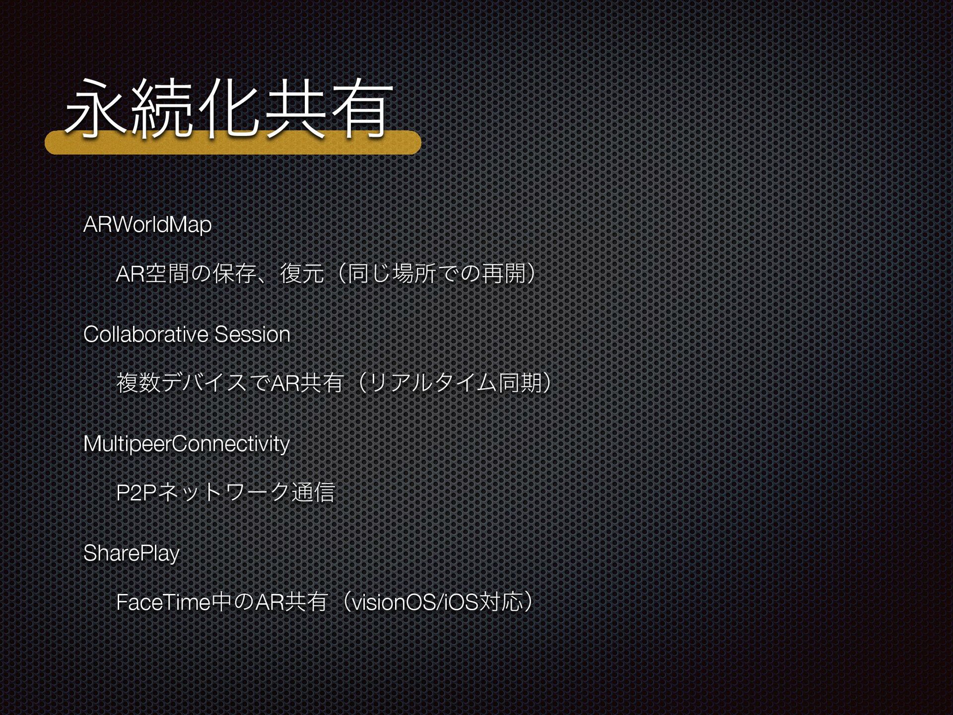 ӬଓԽڞ༗ ARWorldMap ARۭؒͷอଘɺ෮ݩʢಉ͡ॴͰͷ࠶։ʣ Collaborative Session ෳσόΠεͰARڞ༗ʢϦΞϧλΠϜಉظʣ MultipeerConnectivity P2PωοτϫʔΫ௨৴ SharePlay FaceTimeதͷARڞ༗ʢvisionOS/iOSରԠʣ