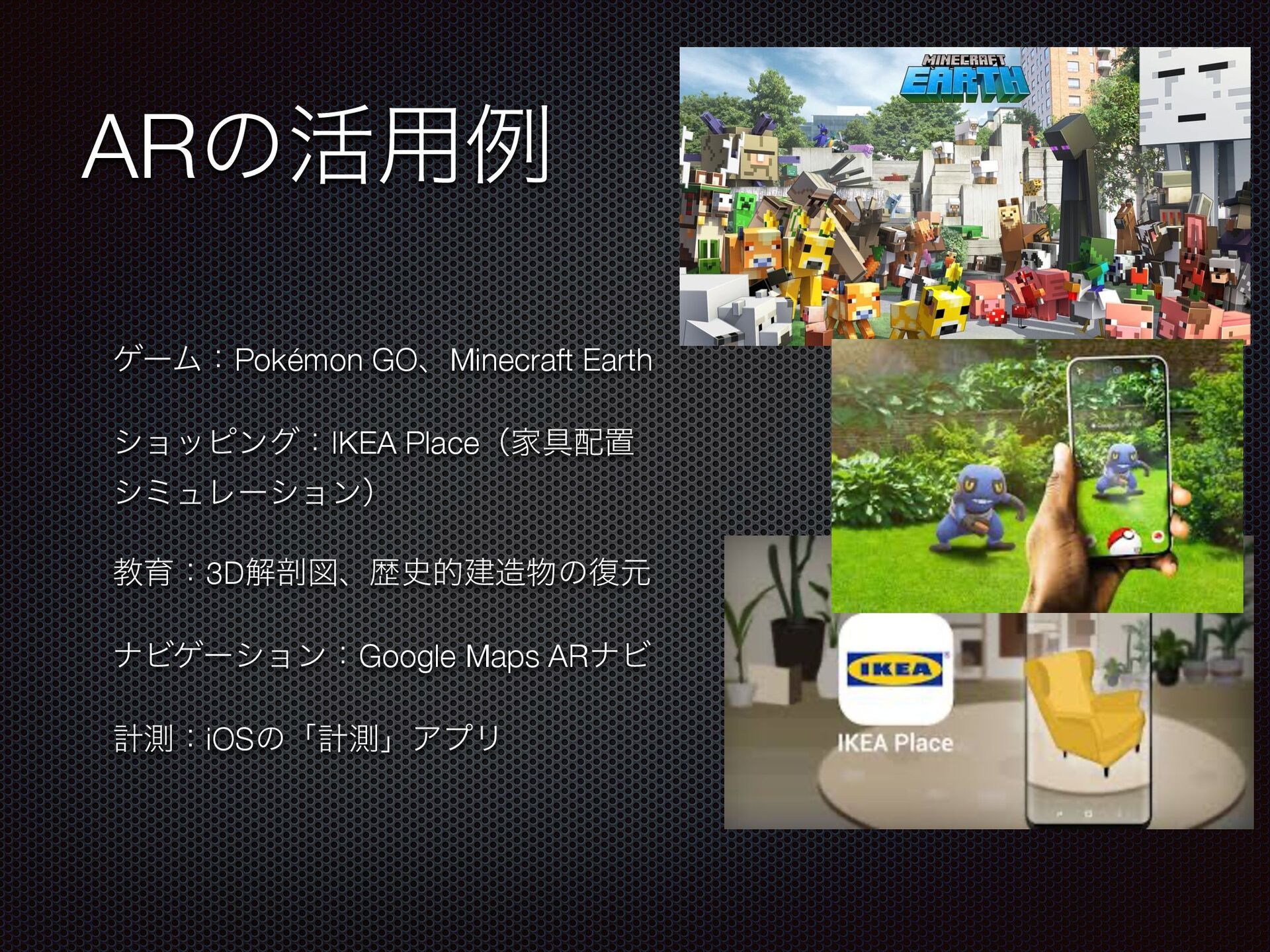 ARͷ׆༻ྫ ήʔϜɿPokémon GOɺMinecraft Earth γϣοϐϯάɿIKEA PlaceʢՈ۩ஔ γϛϡϨʔγϣϯʣ ڭҭɿ3Dղਤɺྺ࢙తݐͷ෮ݩ φϏήʔγϣϯɿGoogle Maps