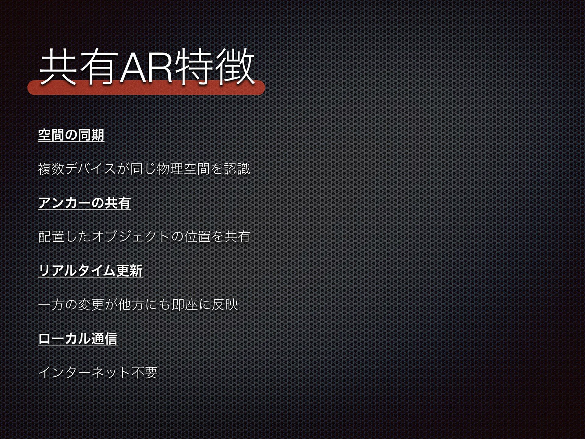 ڞ༗ARಛ ۭؒͷಉظ ෳσόΠε͕ಉ͡ཧۭؒΛೝࣝ ΞϯΧʔͷڞ༗ ஔͨ͠ΦϒδΣΫτͷҐஔΛڞ༗ ϦΞϧλΠϜߋ৽ Ұํͷมߋ͕ଞํʹଈ࠲ʹө ϩʔΧϧ௨৴ Πϯλʔωοτෆཁ