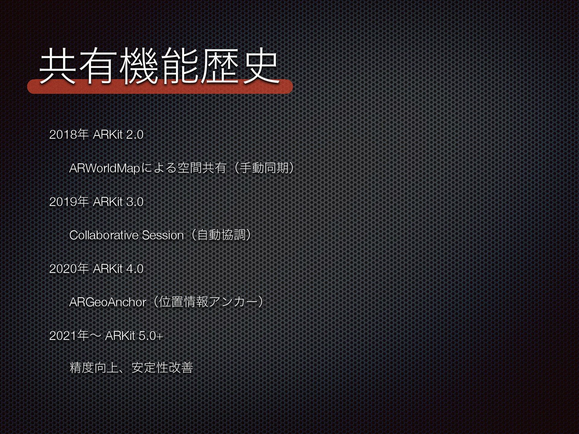 ڞ༗ػೳྺ࢙ 2018 ARKit 2.0 ARWorldMapʹΑΔۭؒڞ༗ʢखಈಉظʣ 2019 ARKit 3.0 Collaborative Sessionʢࣗಈڠௐʣ