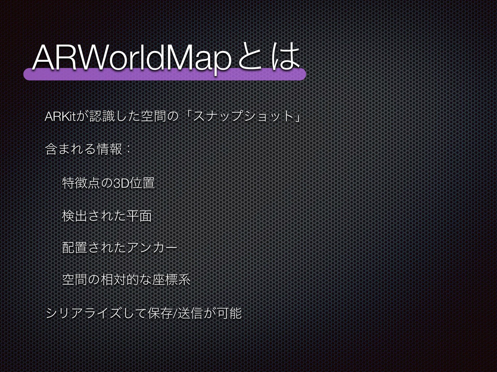 ARWorldMapͱ ARKit͕ೝۭࣝͨؒ͠ͷʮεφοϓγϣοτʯ ؚ·ΕΔใɿ ಛͷ3DҐஔ ݕग़͞Εͨฏ໘ ஔ͞ΕͨΞϯΧʔ ۭؒͷ૬ରతͳ࠲ඪܥ γϦΞϥΠζͯ͠อଘ/ૹ৴͕Մೳ