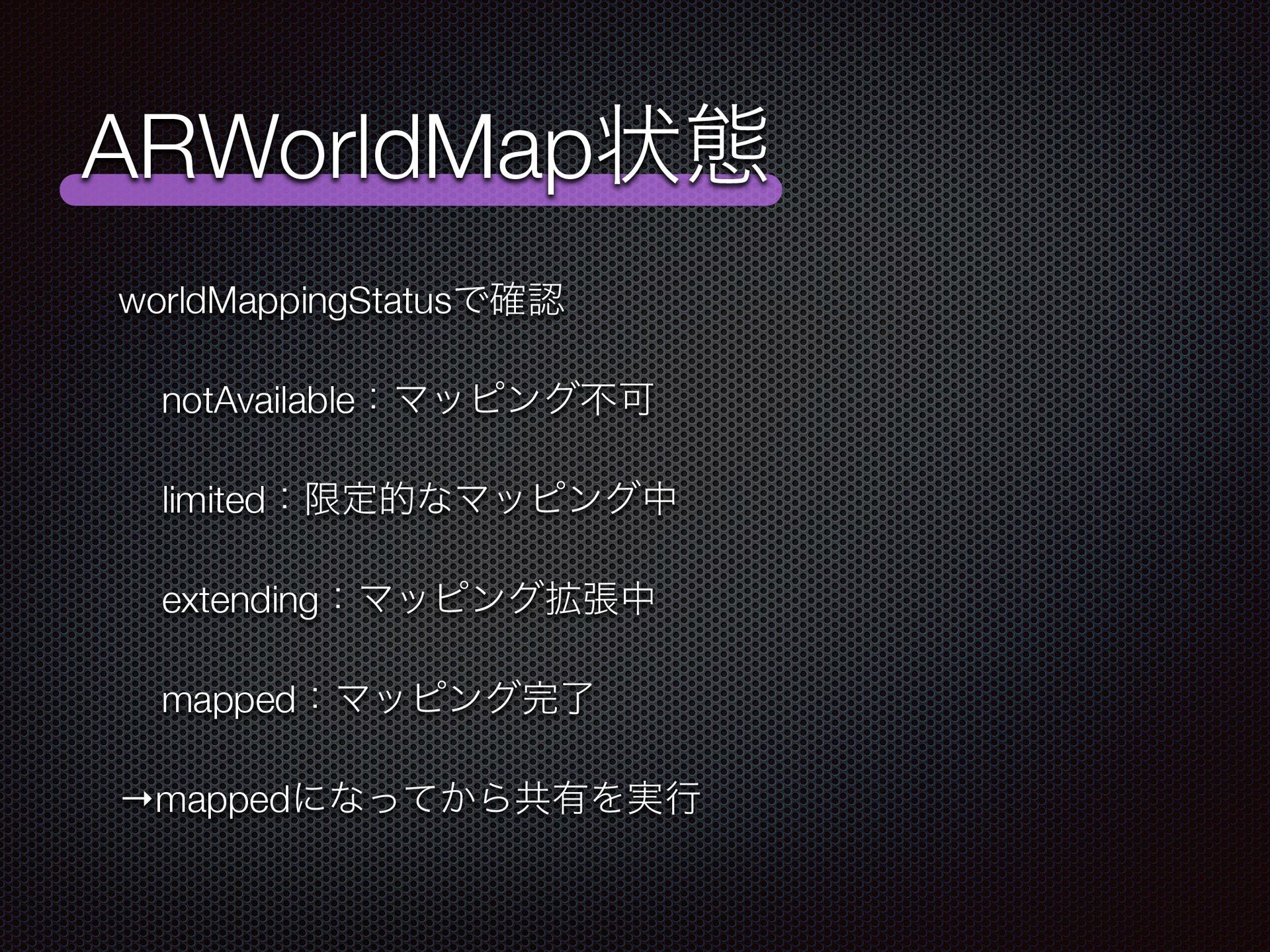 ARWorldMapঢ়ଶ worldMappingStatusͰ֬ೝ notAvailableɿϚοϐϯάෆՄ limitedɿݶఆతͳϚοϐϯάத extendingɿϚοϐϯά֦ுத mappedɿϚοϐϯάྃ →mappedʹͳ͔ͬͯΒڞ༗Λ࣮ߦ