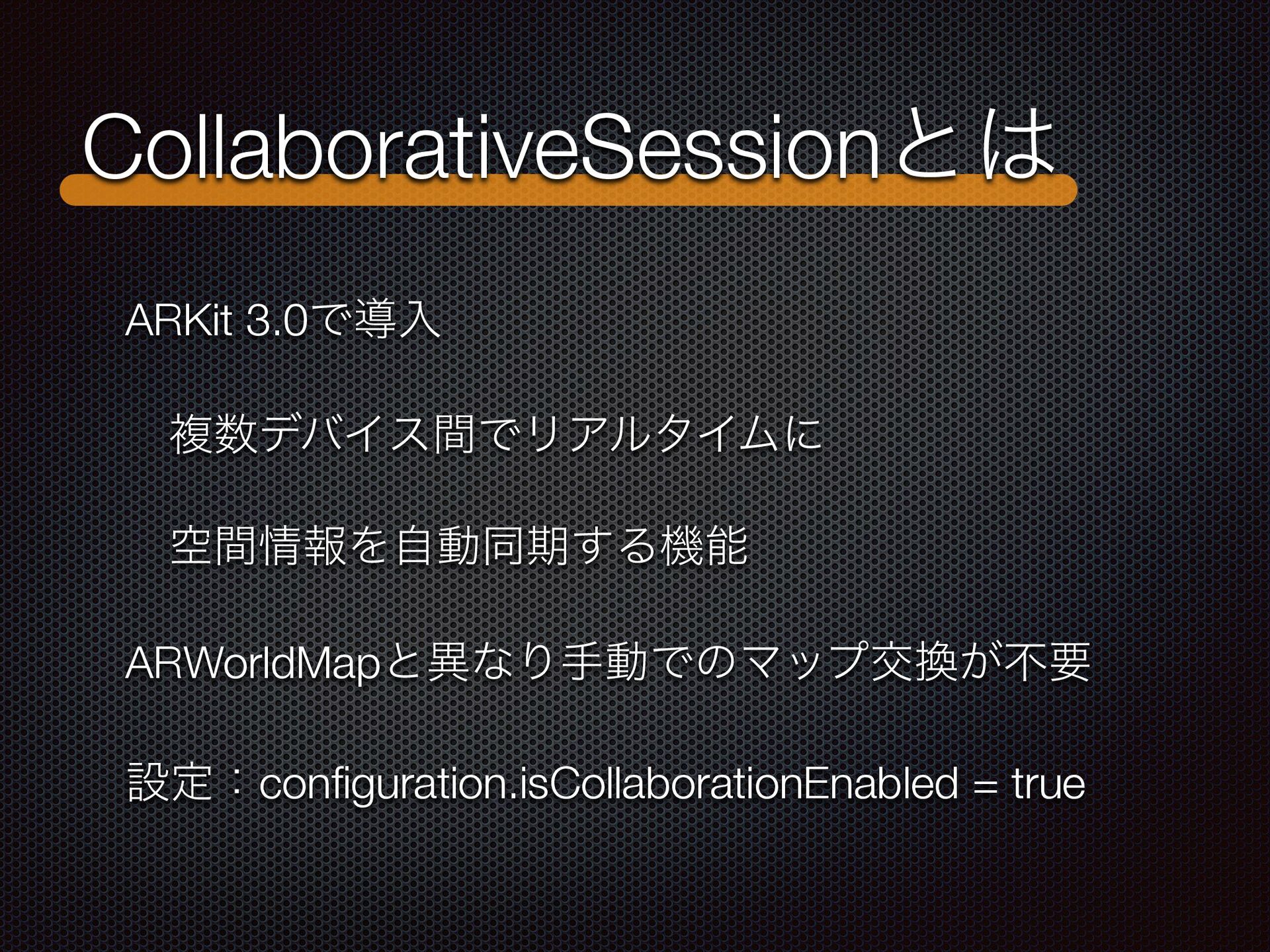 CollaborativeSessionͱ ARKit 3.0Ͱಋೖ ෳσόΠεؒͰϦΞϧλΠϜʹ ۭؒใΛࣗಈಉظ͢Δػೳ ARWorldMapͱҟͳΓखಈͰͷϚοϓަ͕ෆཁ ઃఆɿcon fi guration.isCollaborationEnabled =